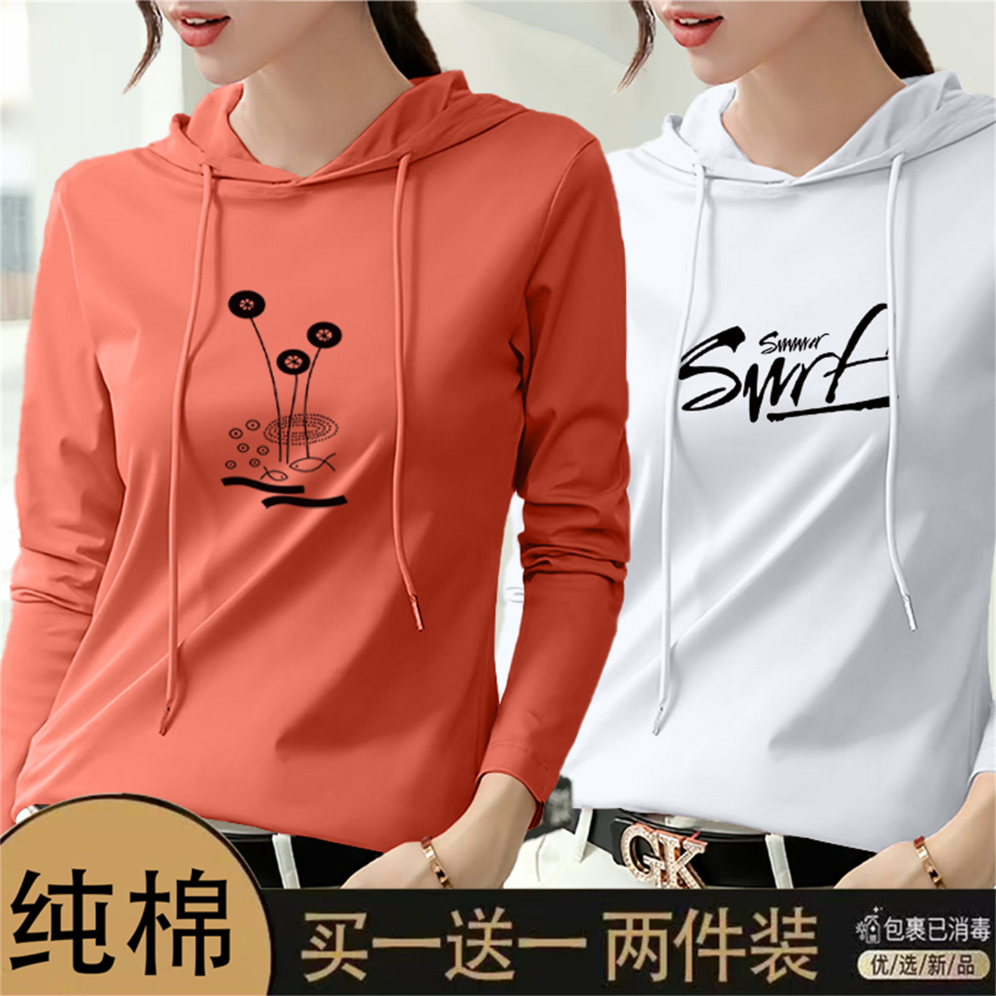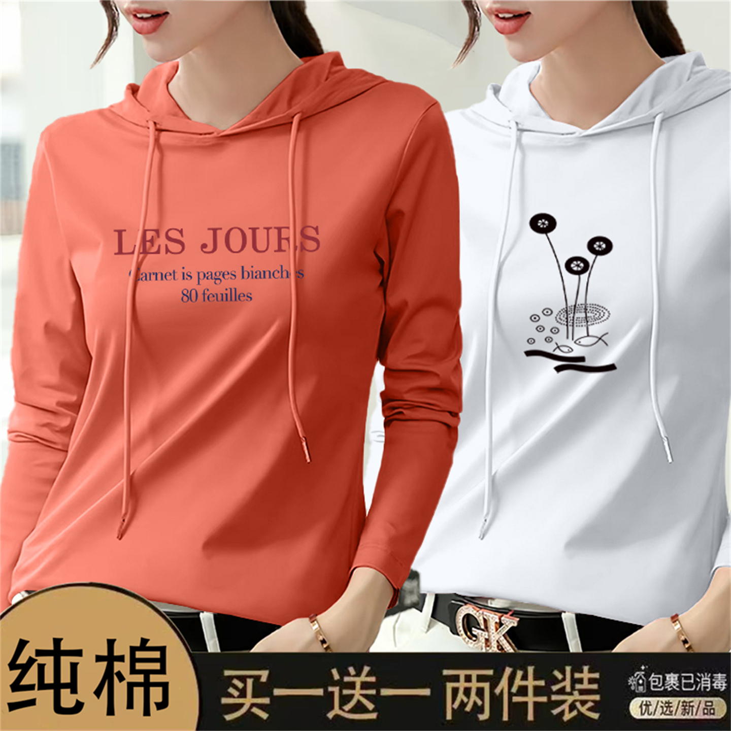 纯棉长袖t恤女大码女装2025春秋新款韩版宽松连帽百搭休闲上衣服
