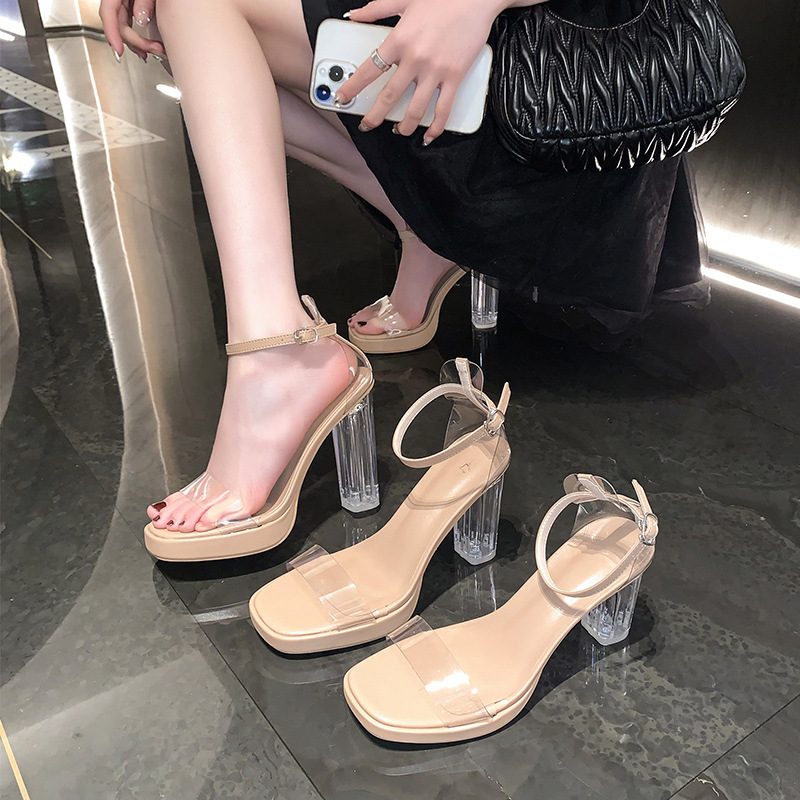夏季新款12CM粗跟超高跟凉鞋夜店性感防水台透明水晶T台走秀女鞋