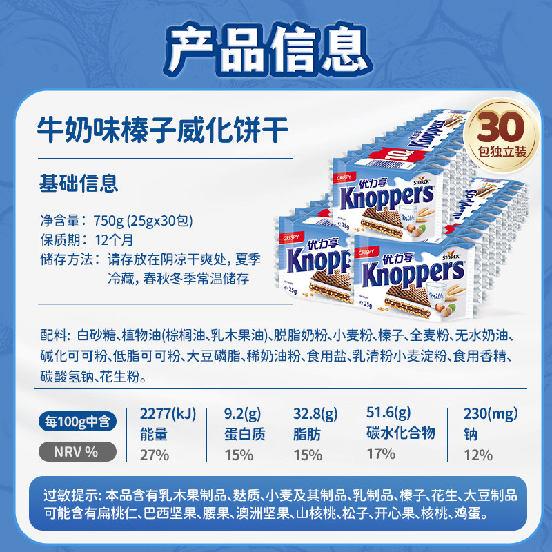 Knoppers优力享德国进口牛奶榛子巧克力威化饼干750g休闲食品零食