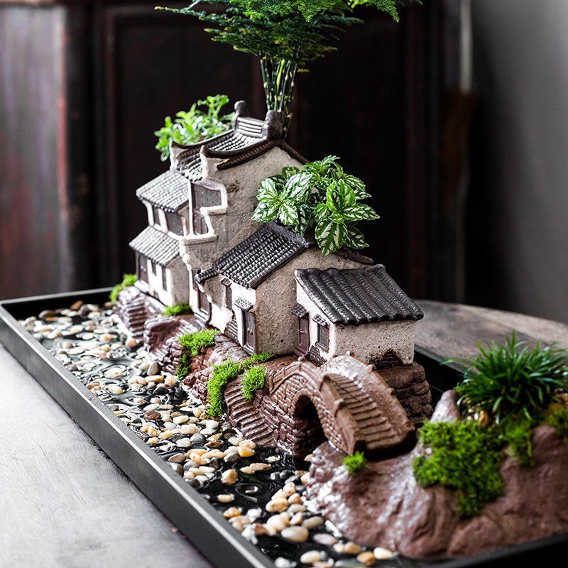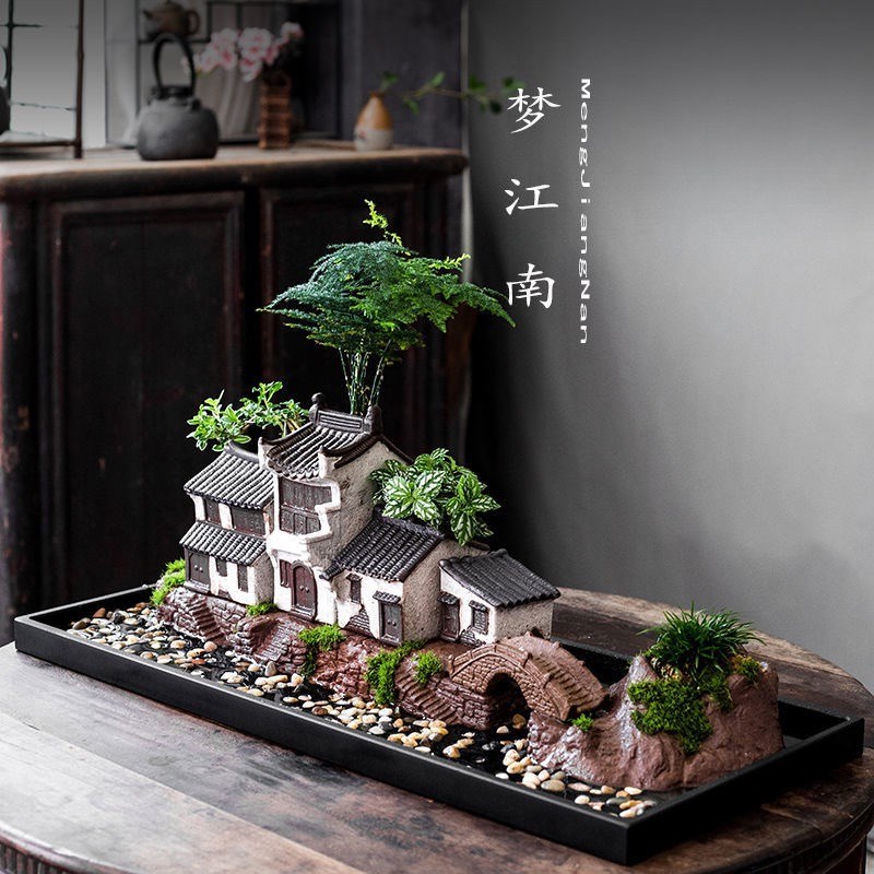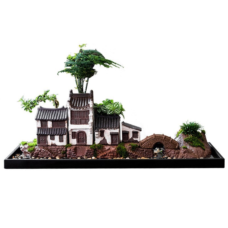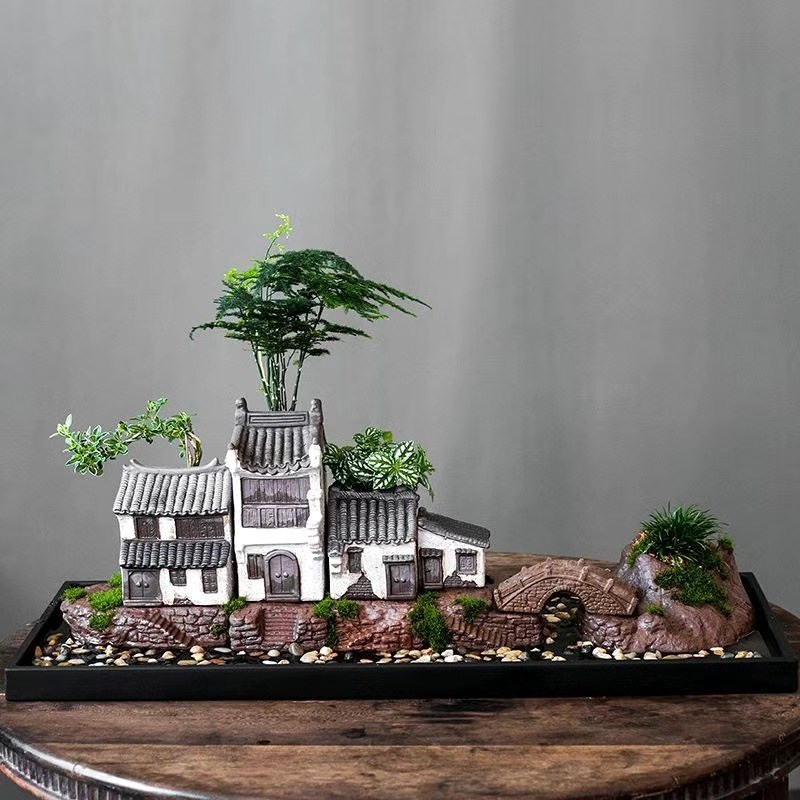 中式创意江南老房子盆景陶瓷花盆桌面鱼缸造景装饰托盘微景观摆件