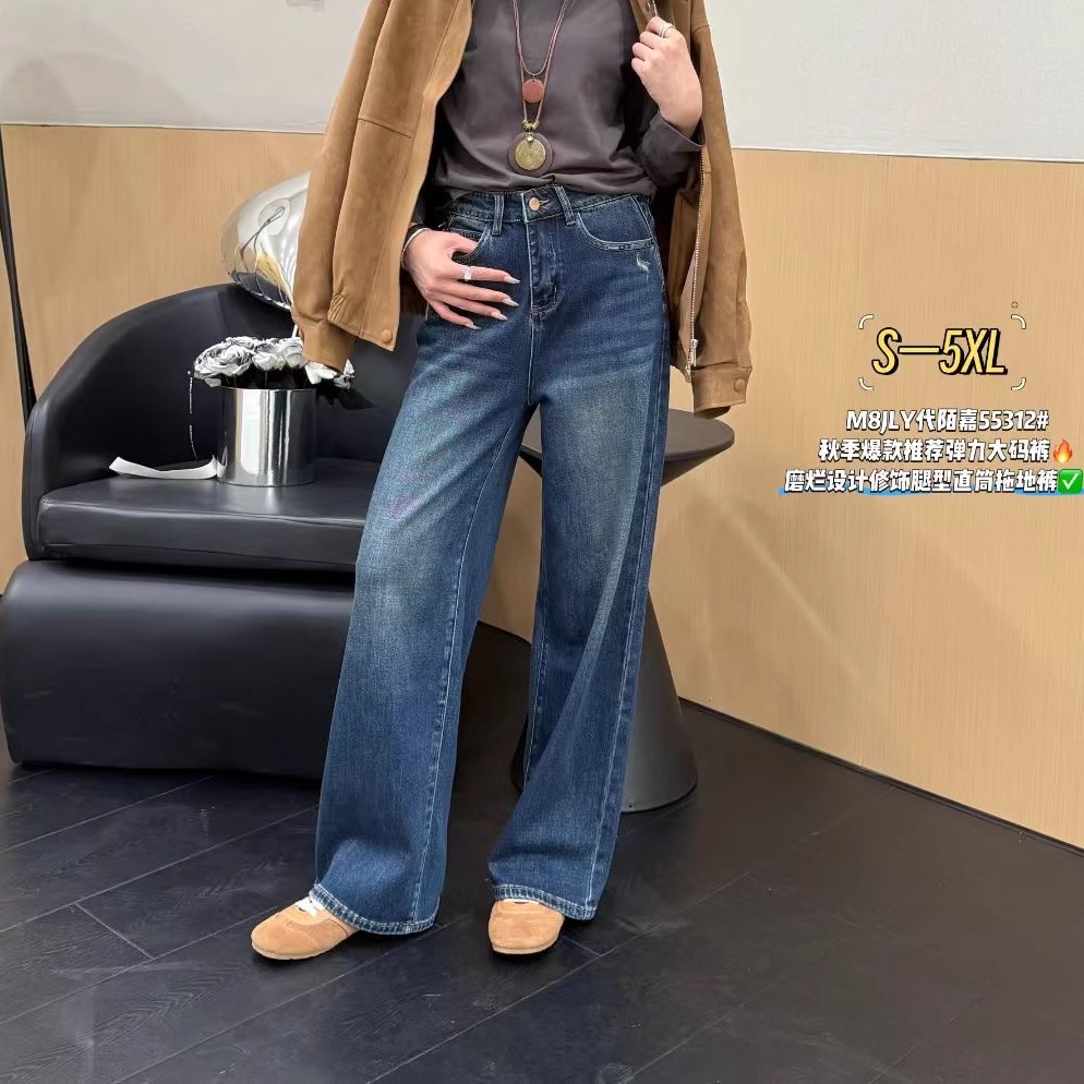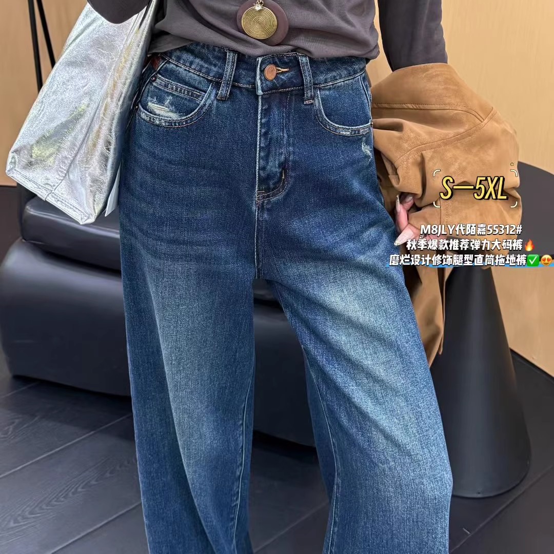 55312#时尚简约百搭弹力窄版牛仔直筒裤女深蓝色秋季拖地裤窄窄裤