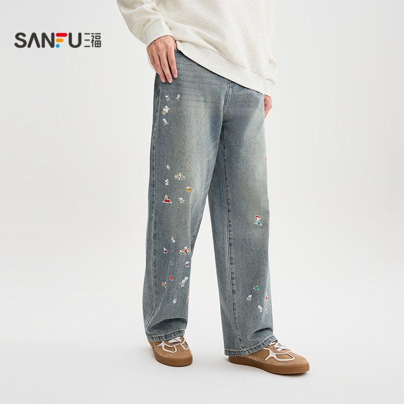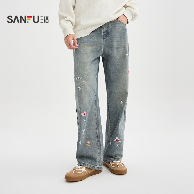 【史努比联名】三福2025秋冬男士贴纸印花直筒牛仔裤507785