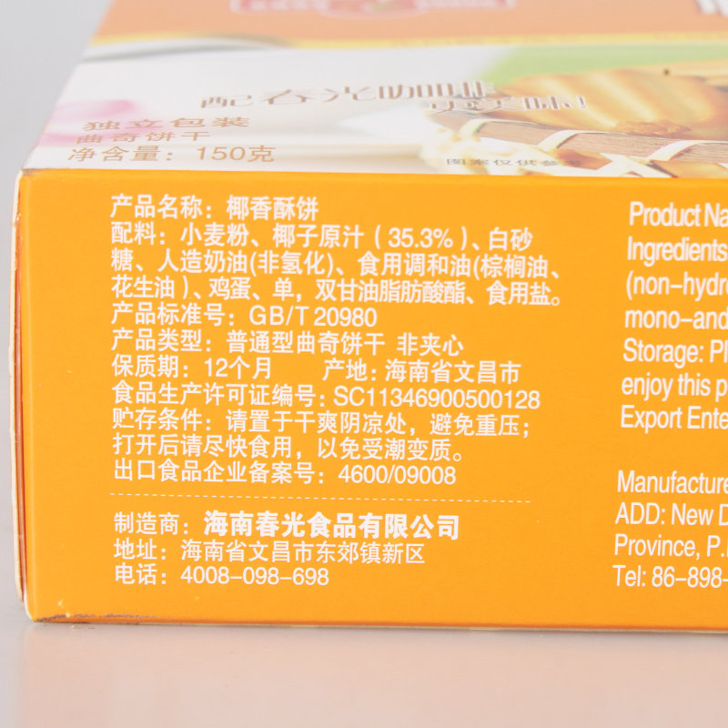 海南特产 春光椰香酥饼150g 酥脆椰香椰奶椰子饼干糕点零食