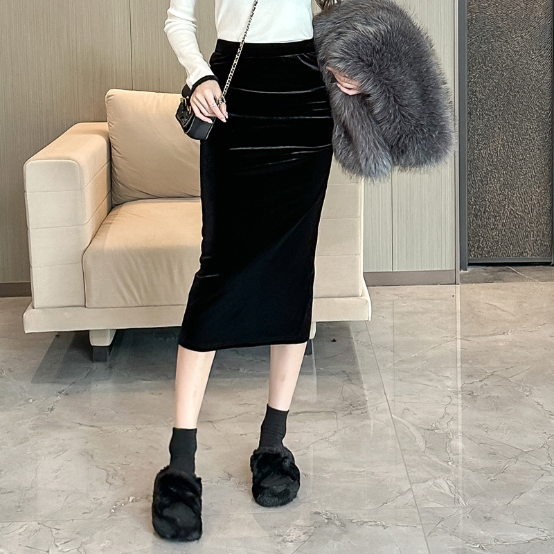 金丝绒复古开叉半身裙女高腰显瘦一步裙秋冬高级感中长款包臀裙子
