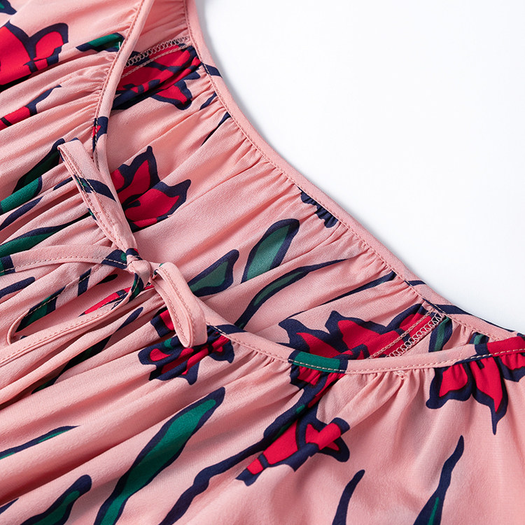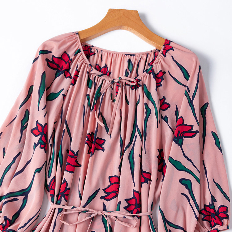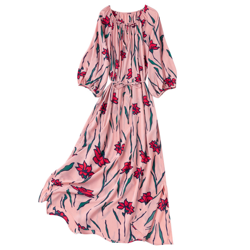 好面料真丝弹力双绉!裙长1.2米!粉嫩圆领八分灯笼袖连衣裙开叉