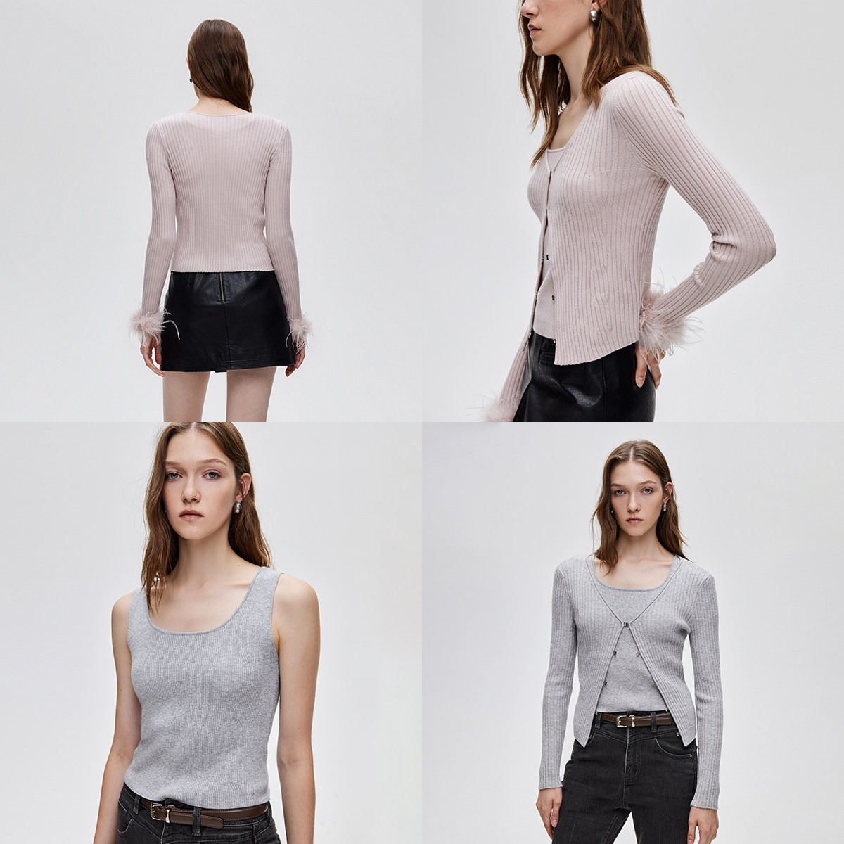 ONLY2026春季新款羽毛袖口V领正肩两件套含绵羊毛毛衣针织衫女