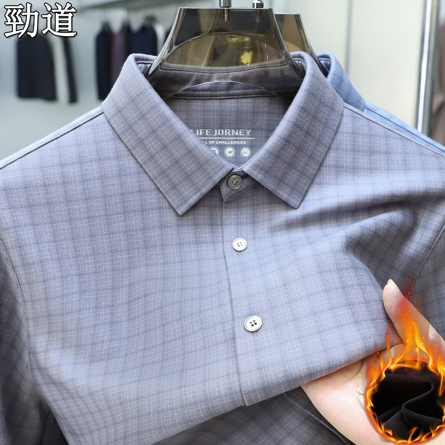 男士长袖羽绒衬衫冬季商务休闲加绒免烫寸衫中年男士格子衬衣男新