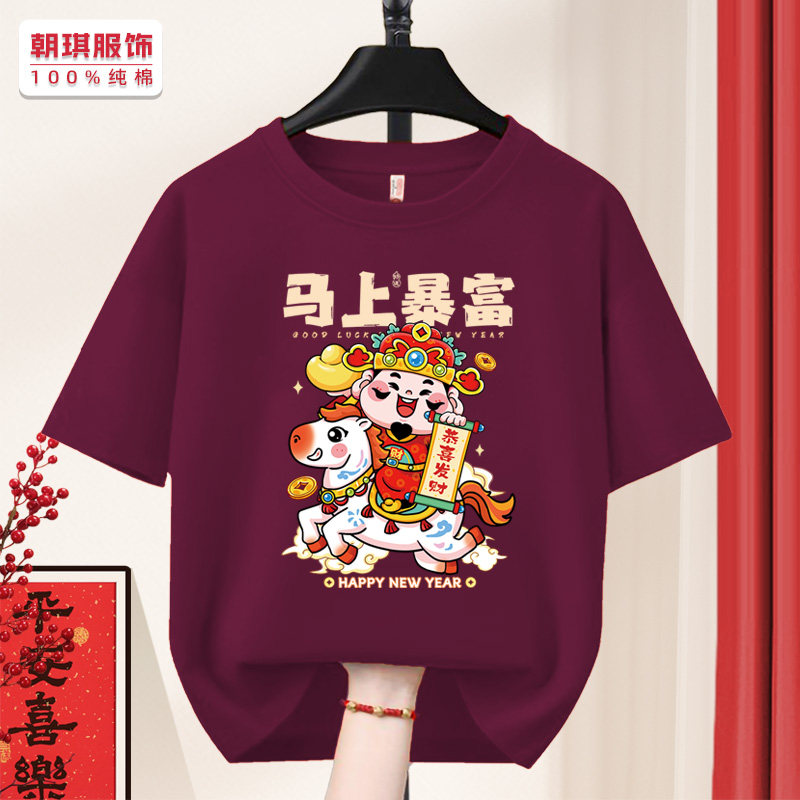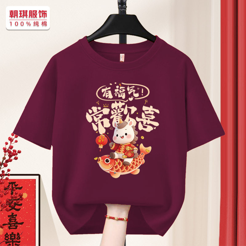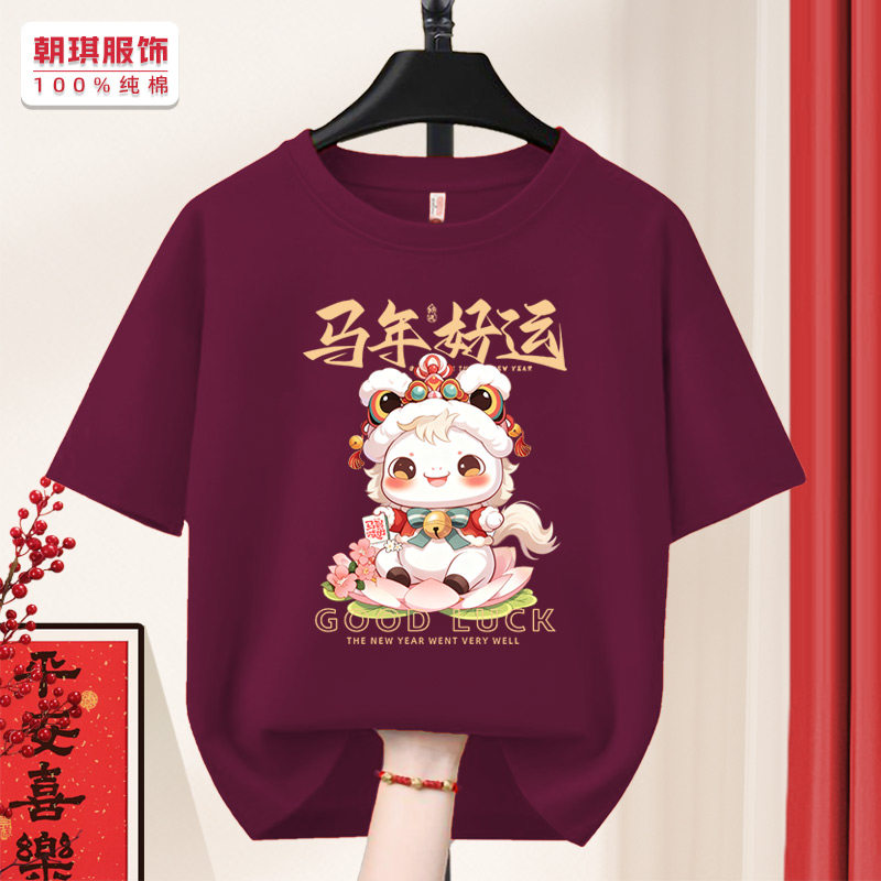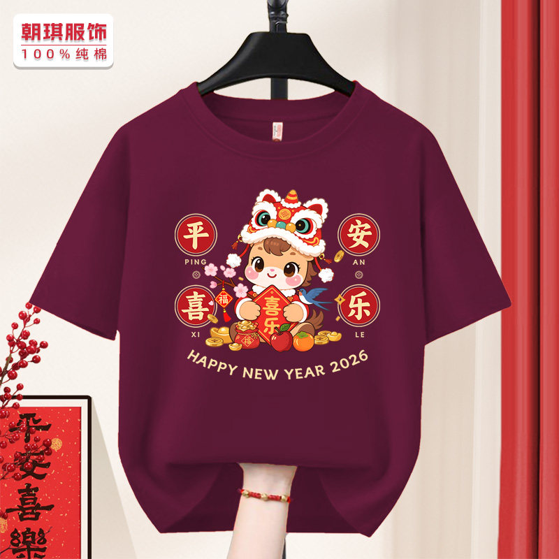 2026马年t恤男女短袖情侣装新年春节过年年会活动衣服酒红色纯棉