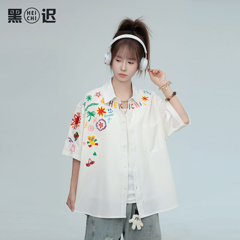 黑迟原创刺绣卡通涂鸦短袖衬衫夏季宽松设计感男女同款休闲小众衬