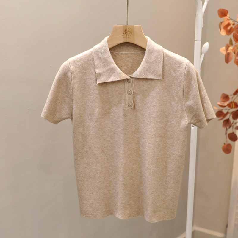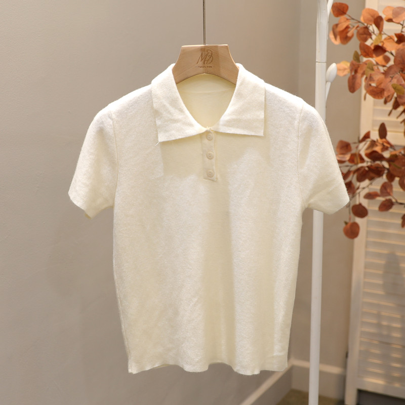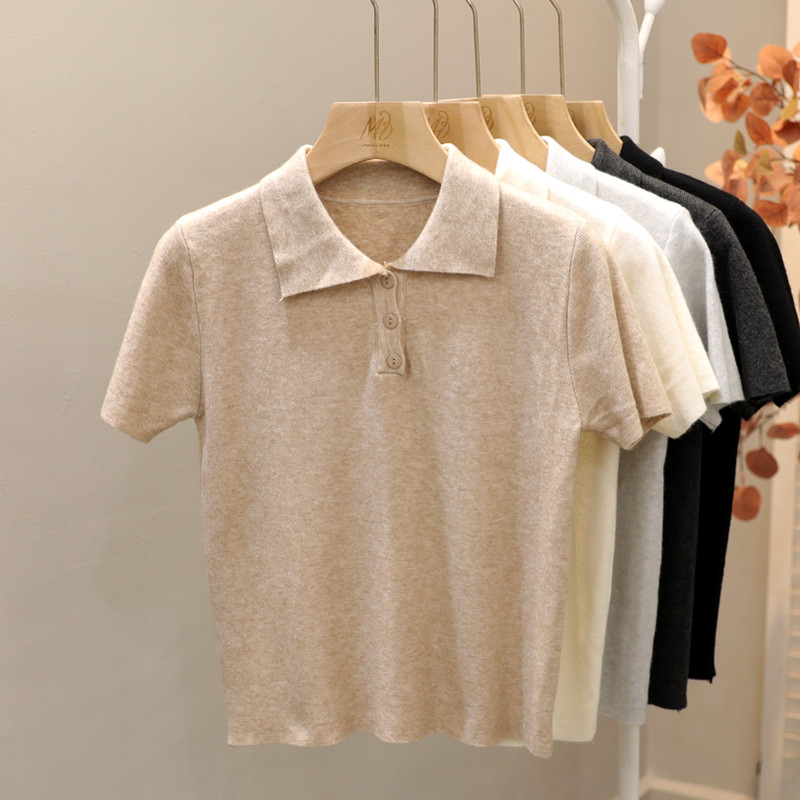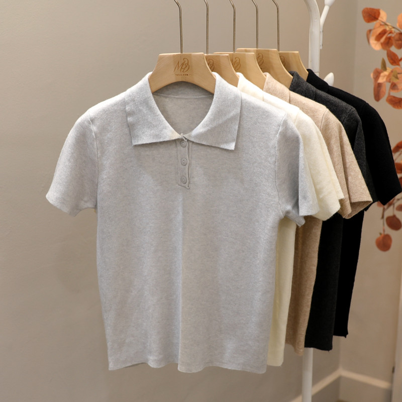 翻领纽扣套头针织短袖女2025春夏季修身短款百搭简约打底小衫上衣