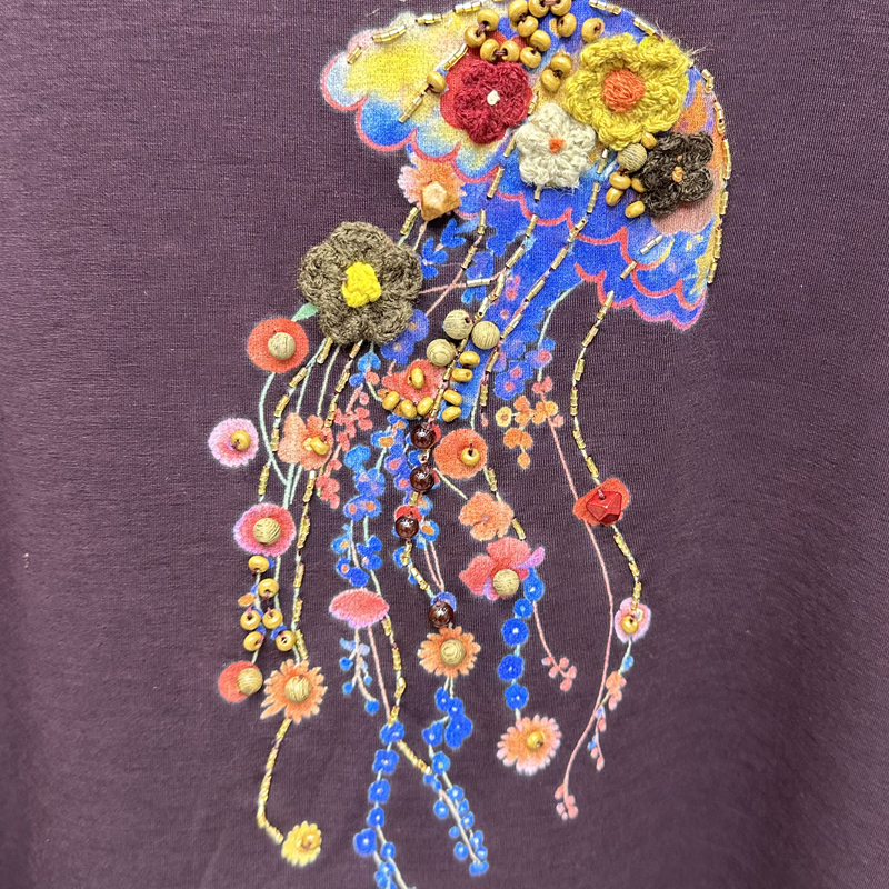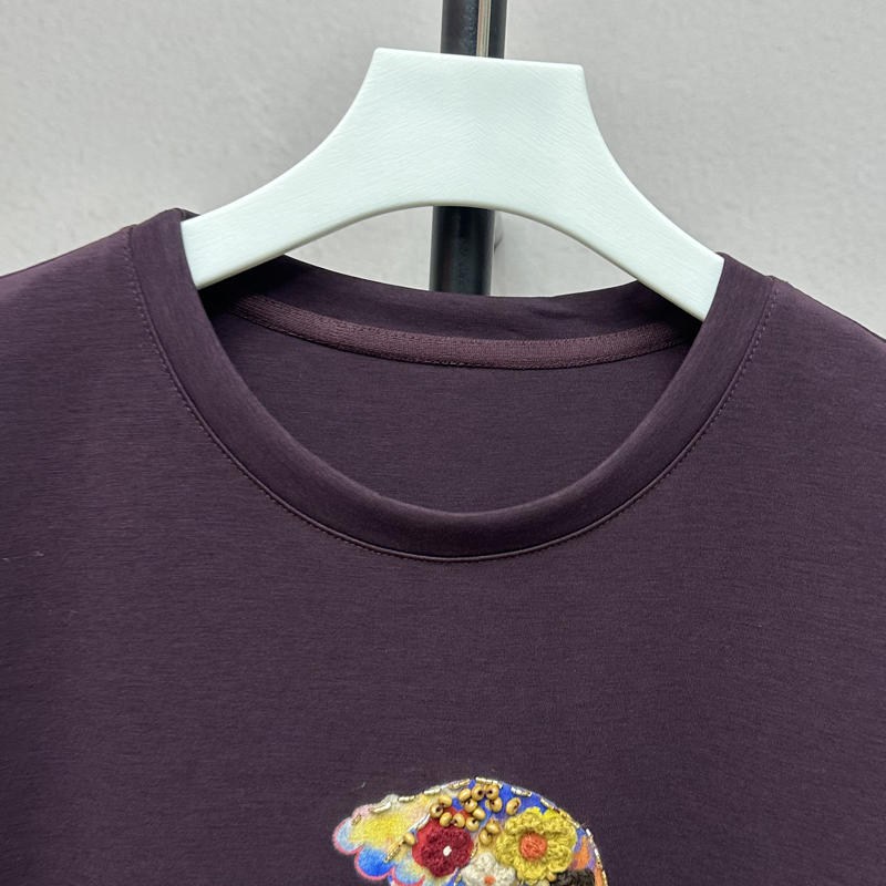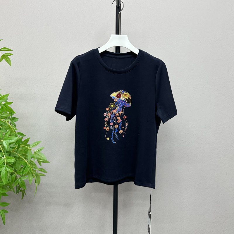 欧洲站2025秋时尚刺绣水母花朵圆领T恤休闲宽松百搭上衣女25306X