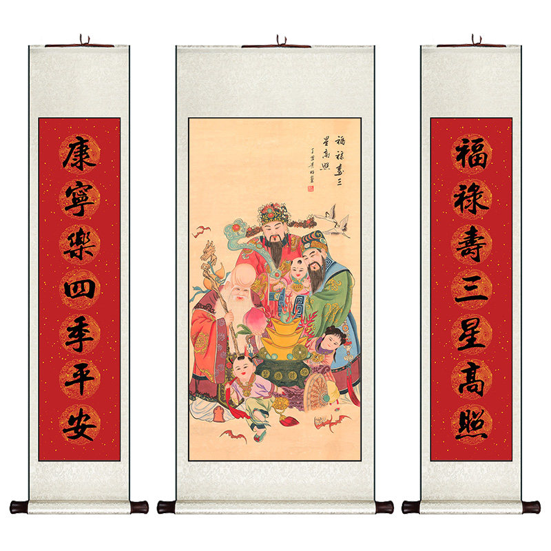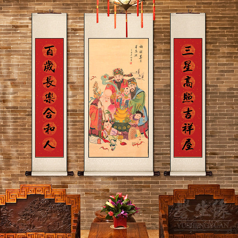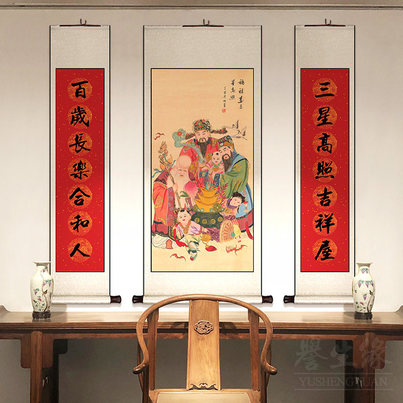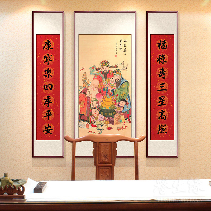 福禄寿三星高照中堂挂画卷轴中式玄关装饰画竖版餐厅书房客厅壁画