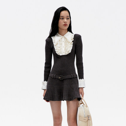 lefame拉飞姆春季新款法式摩登蕾丝深灰重要场合针织连衣裙女