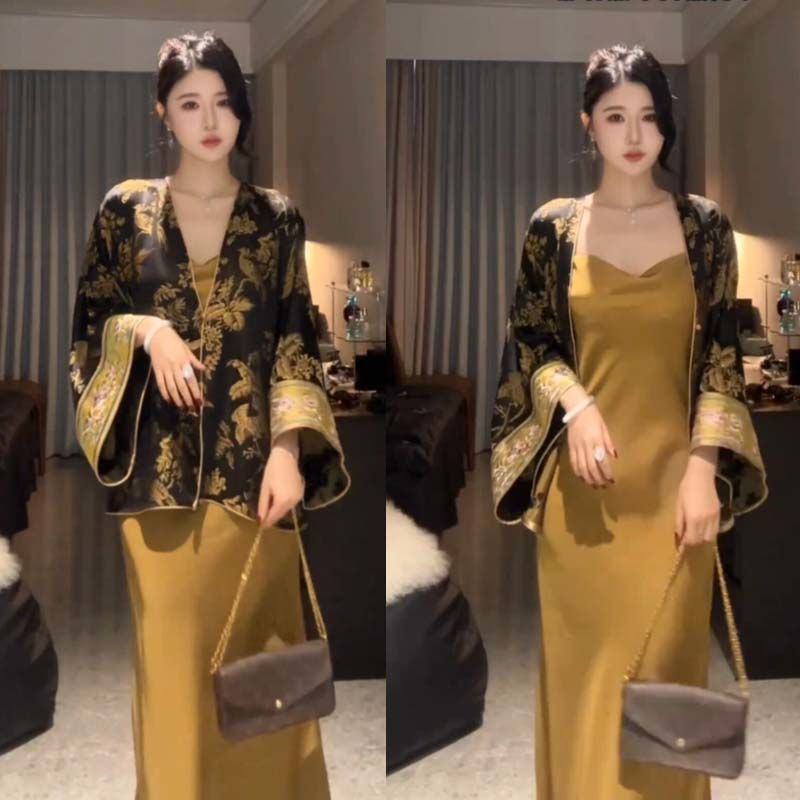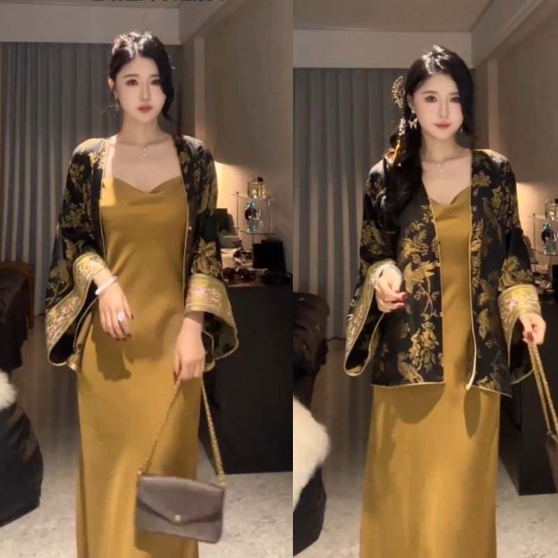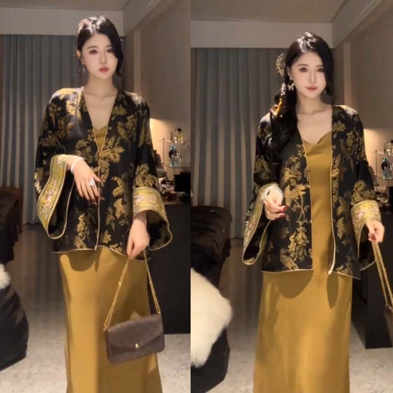 秋装女款2024年新款新中式禅意风中式开衫上衣外套吊带裙两件套装