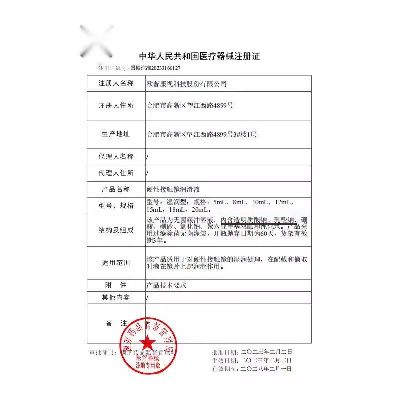 欧普康视镜特舒润眼液隐形眼镜润滑液RGP/OK镜硬性角膜镜用护理液