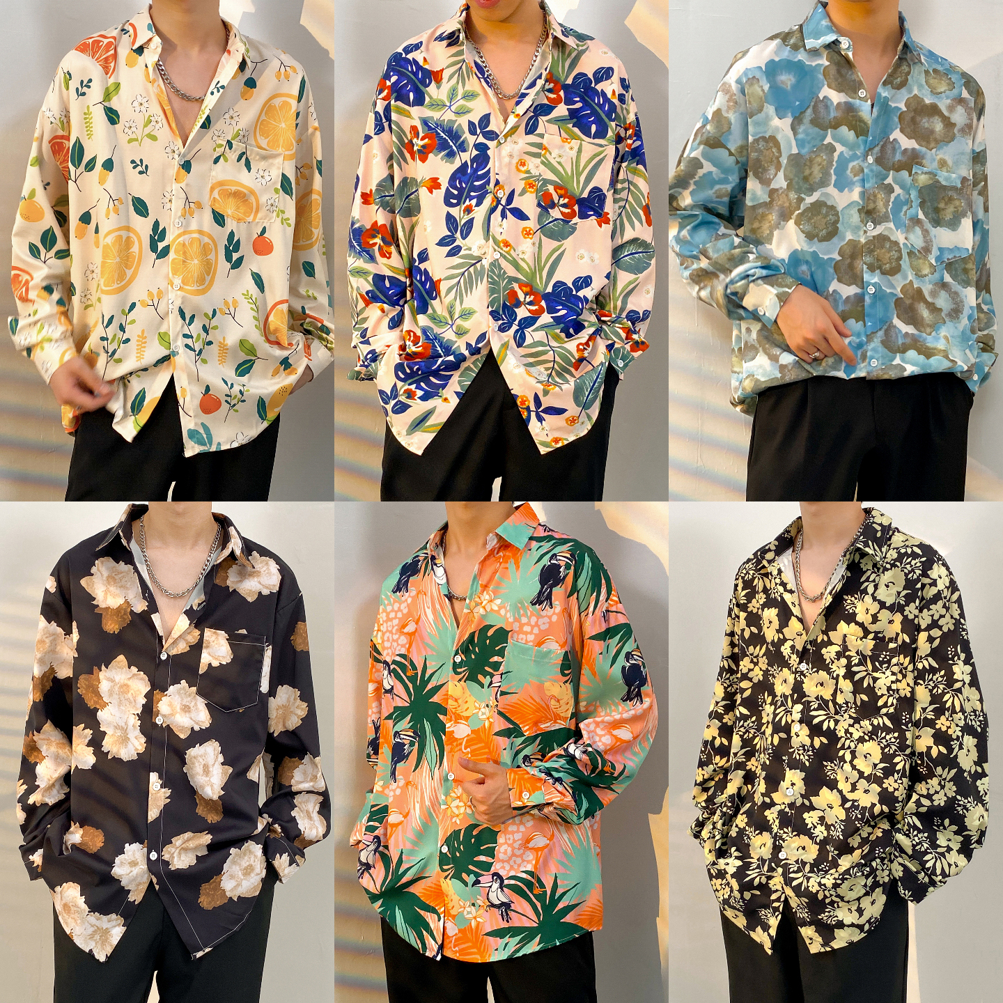 复古港风vintage长袖花衬衫男女日系古着夏威夷小众情侣衬衣外套