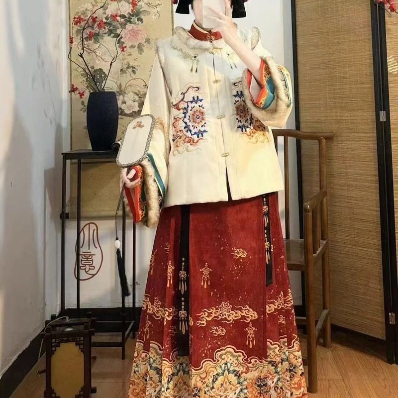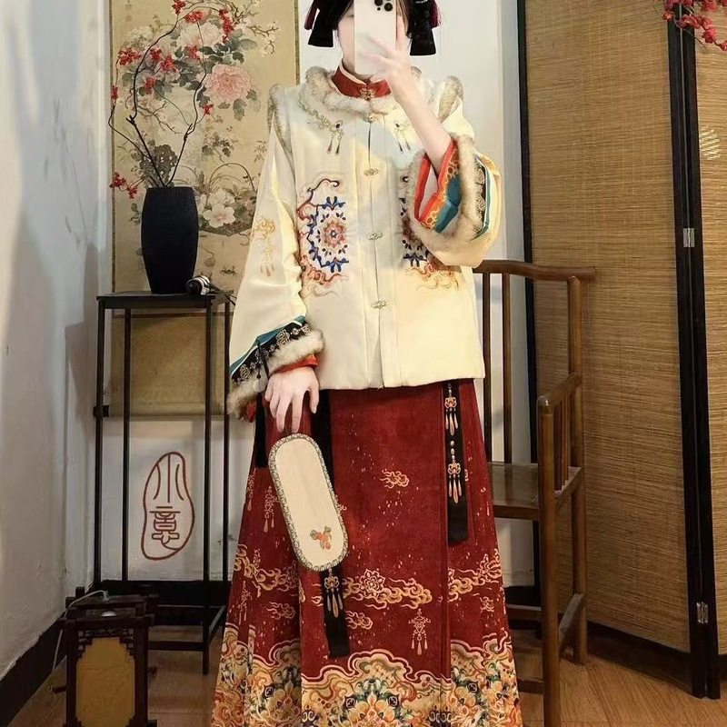 大码汉服女200斤胖mm加绒加厚比甲马面裙套装明制显瘦冬季拜年服