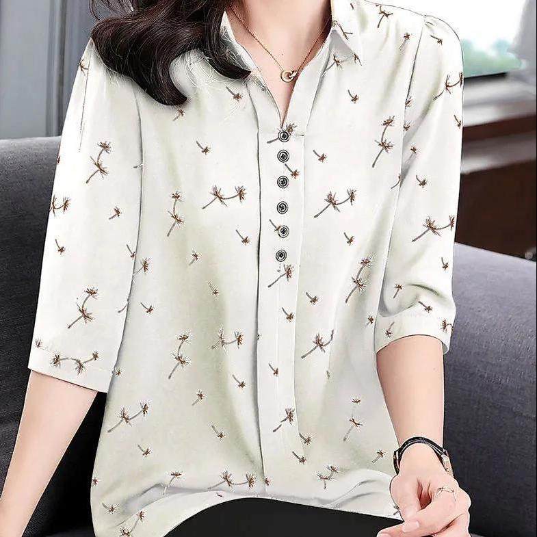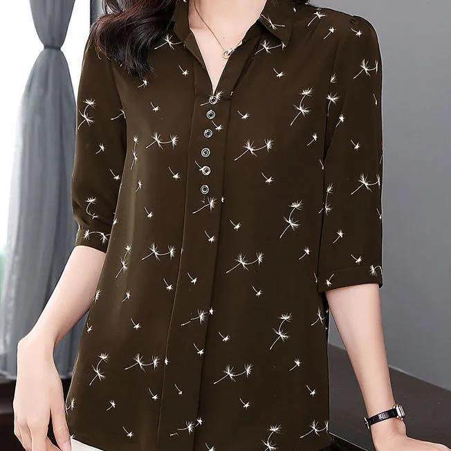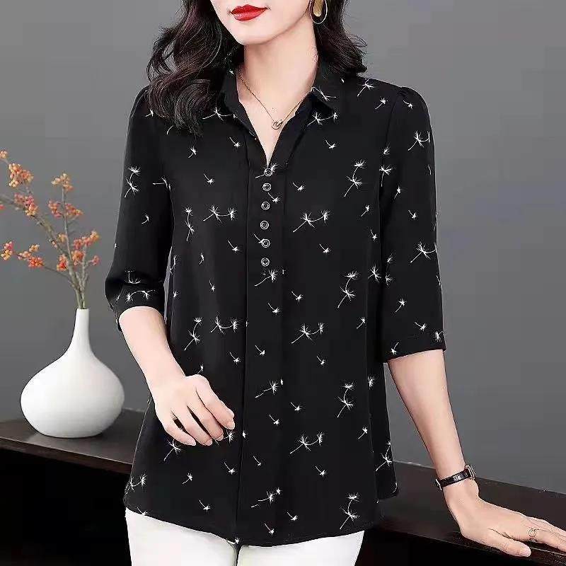 加肥大码宽松雪纺衬衫七分袖女上衣春夏季妈妈显瘦碎花中袖衬衣潮