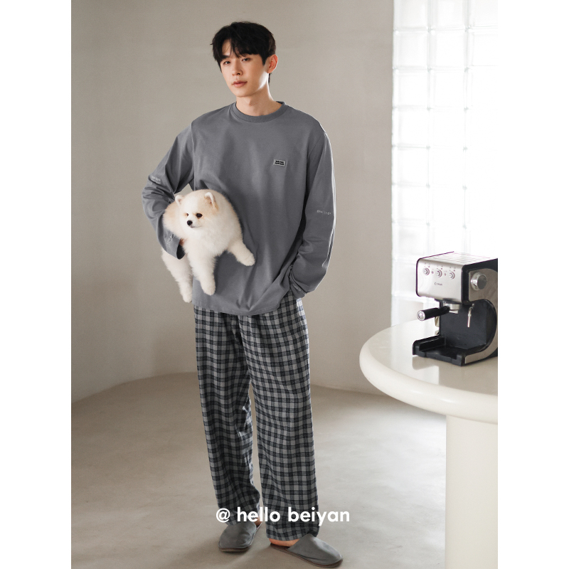 贝妍睡衣春秋季男新款柔软棉家居服圆领套头长袖格子长裤宽松套装