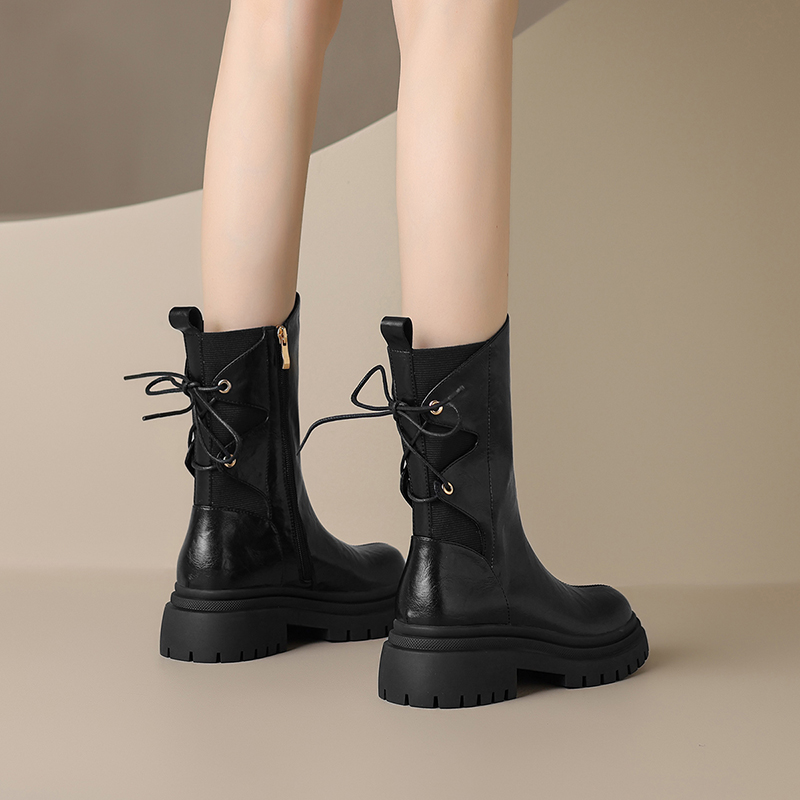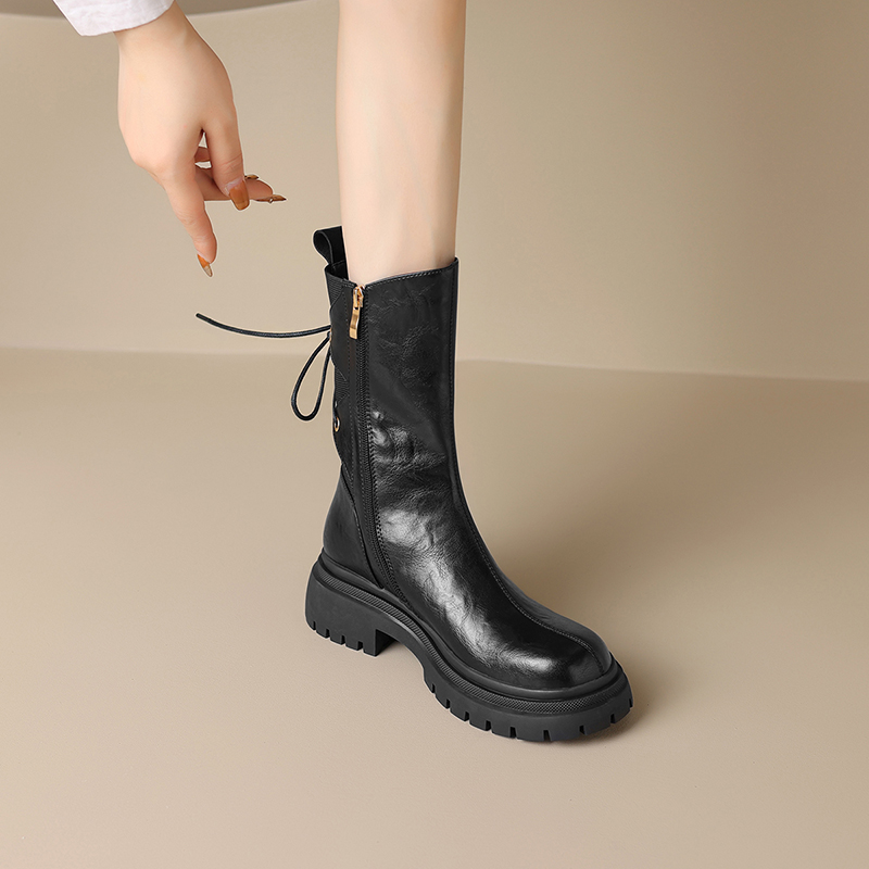 阿么手工女鞋真皮中筒靴时装靴秋冬新款厚底皮鞋圆头英伦风短靴女