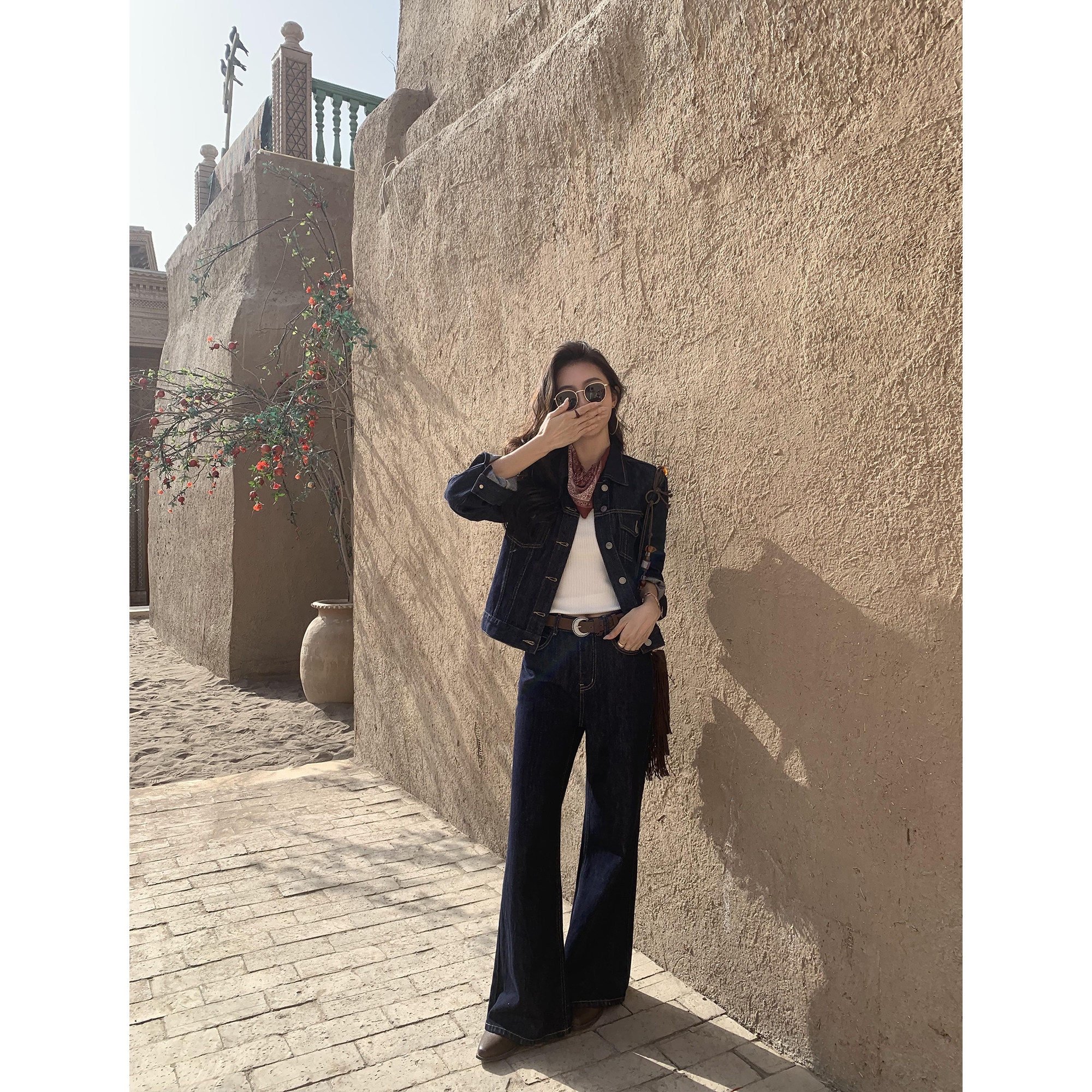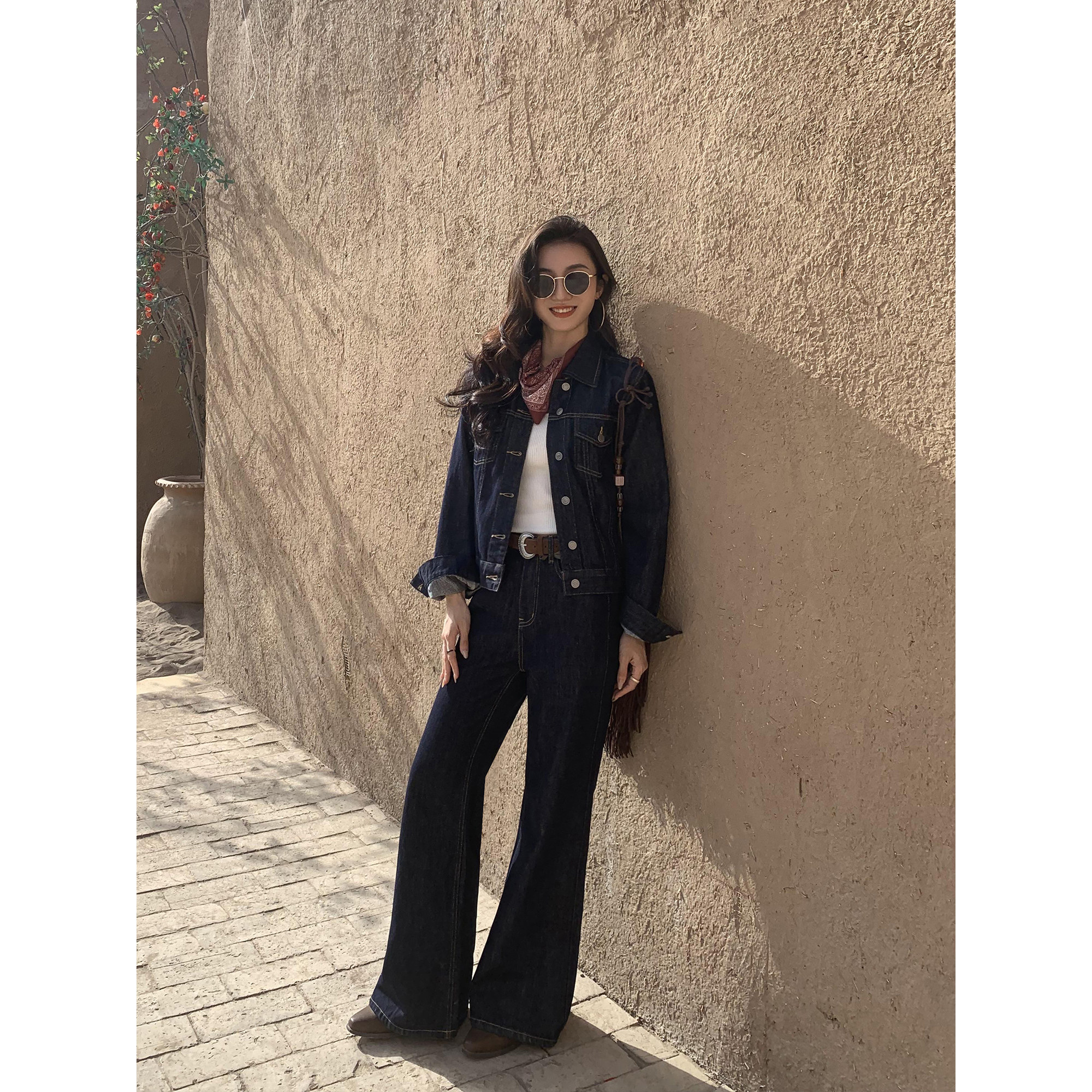 MULVAN 型走都市 复古牛仔套装女宽松原色外套+高腰喇叭阔腿裤