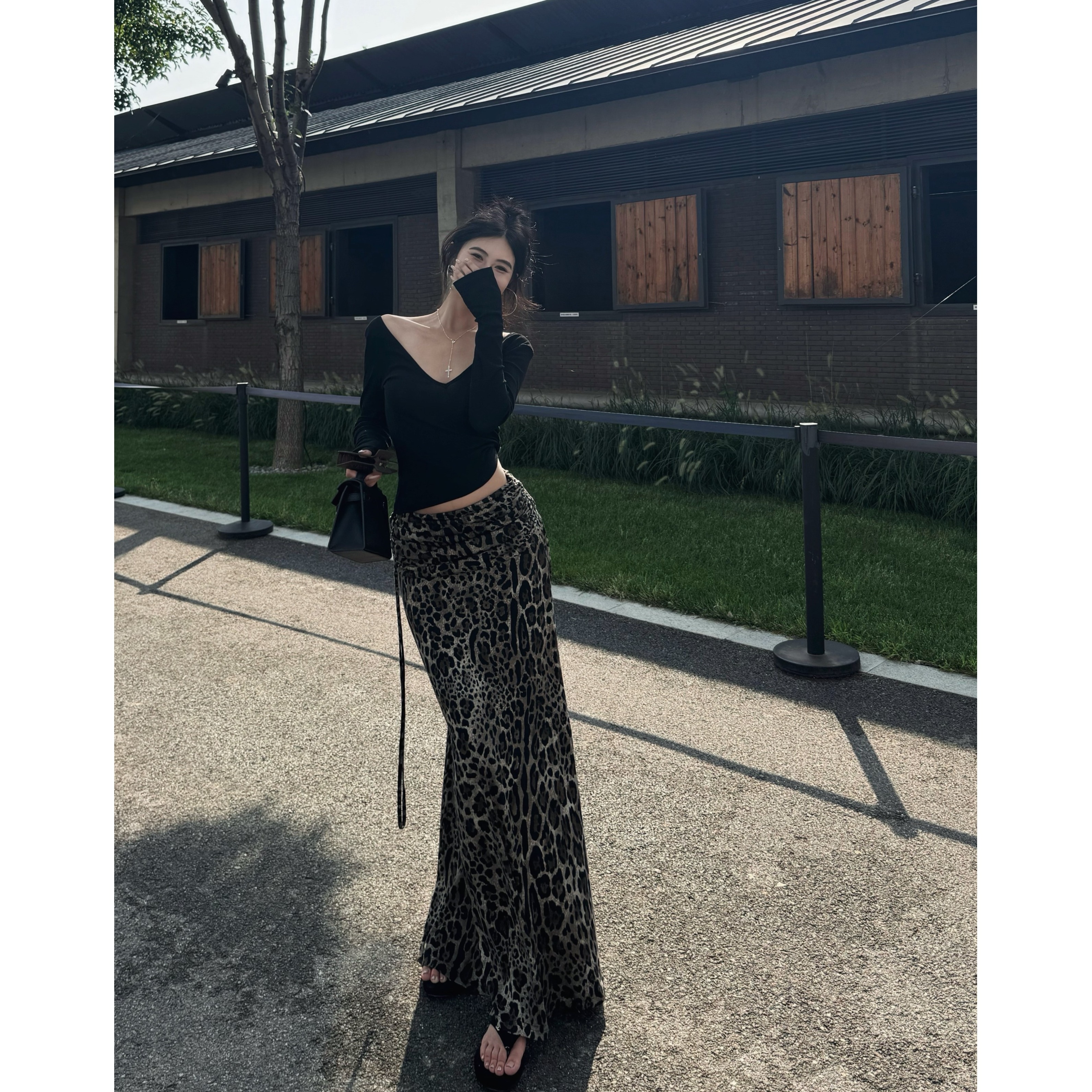 简约百搭套装女秋季2025新款v领打底衫上衣显瘦豹纹半身裙两件套