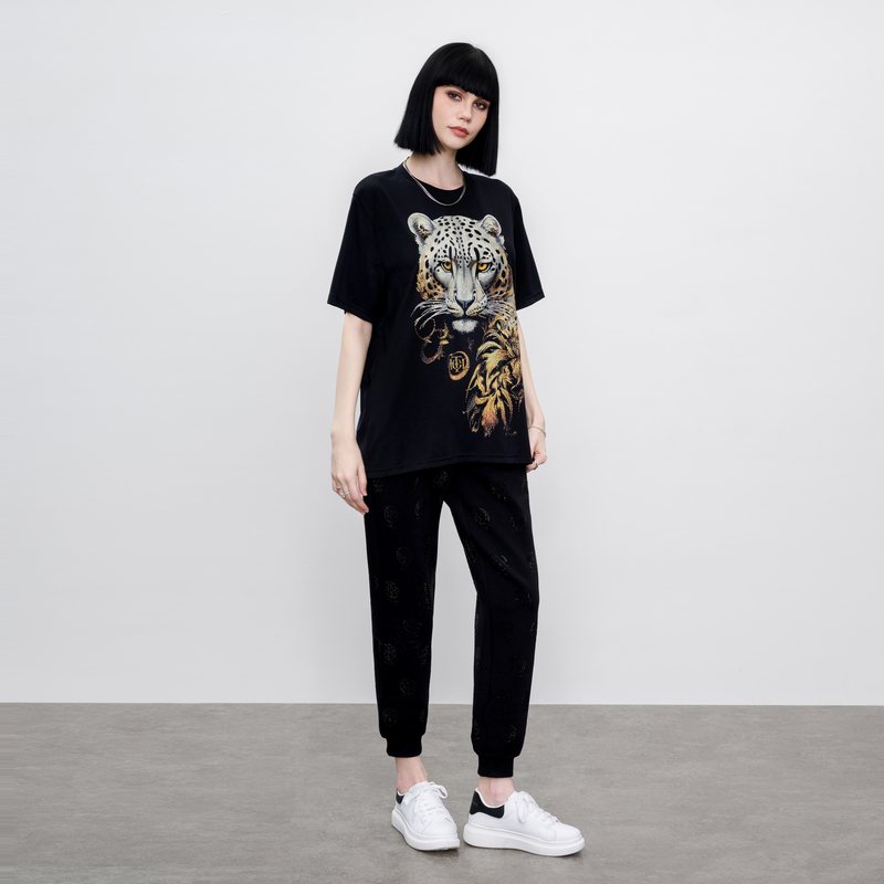 TCH高街潮流烫钻野性豹宽松圆领短袖T恤男女同款夏季新款
