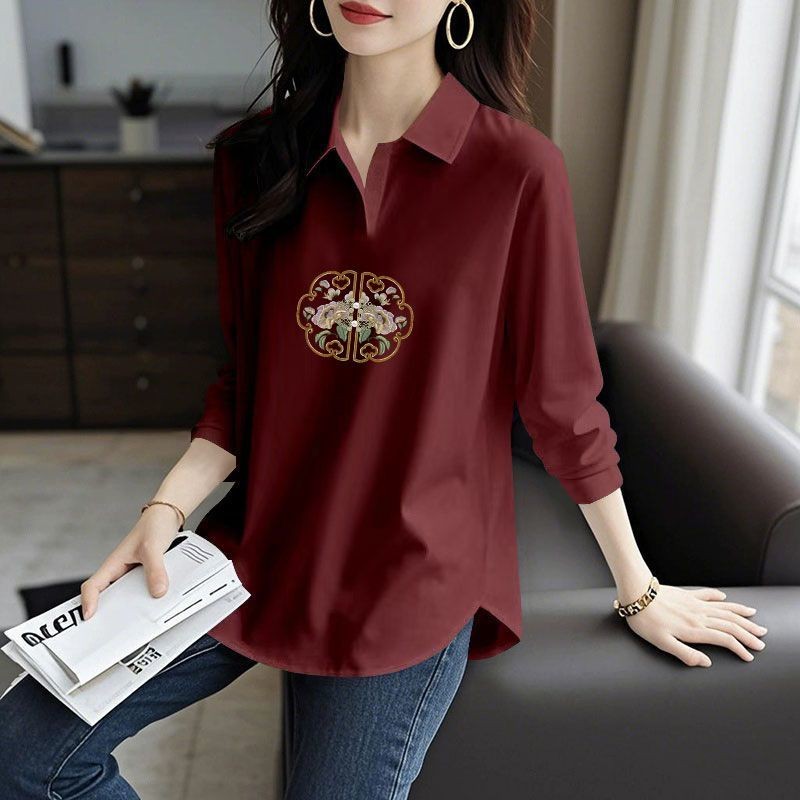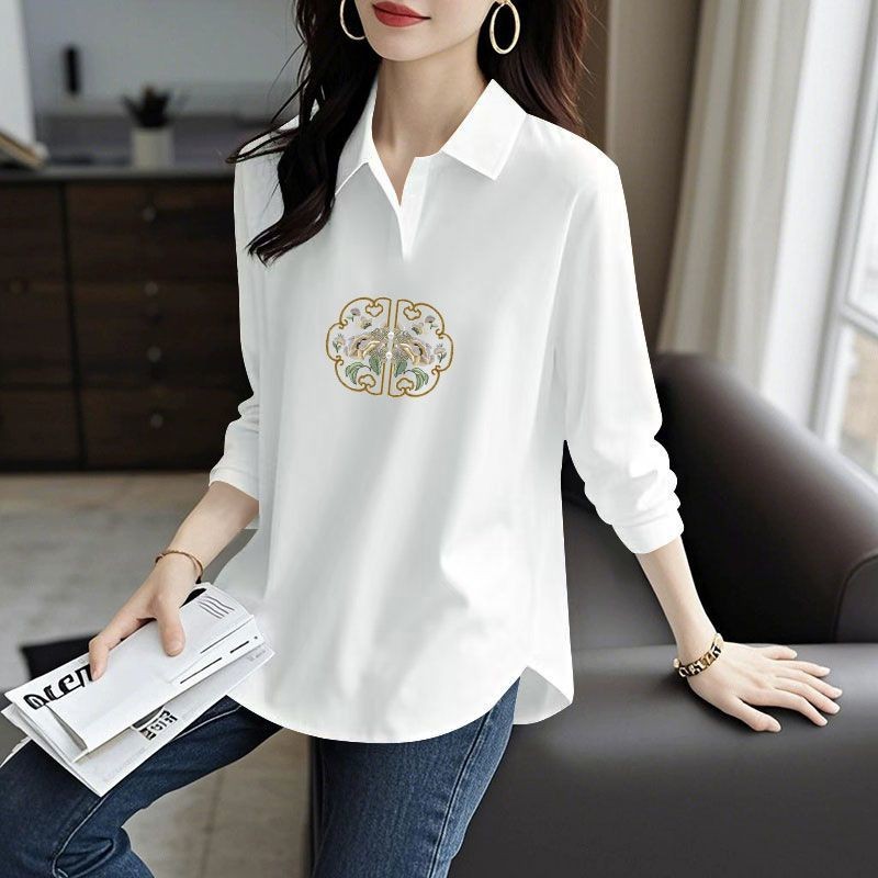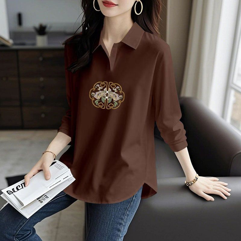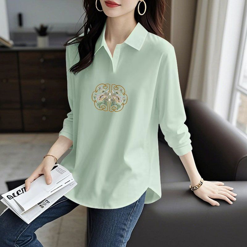春秋爆款纯棉弧形长袖POLO衫T恤女时尚洋气新款百搭宽松翻领上衣