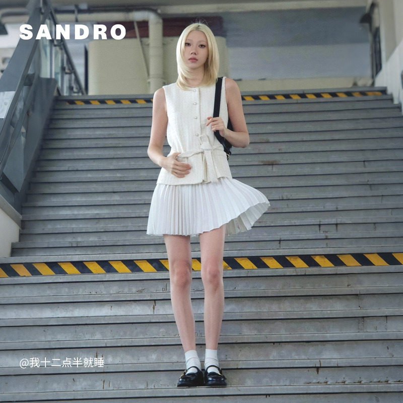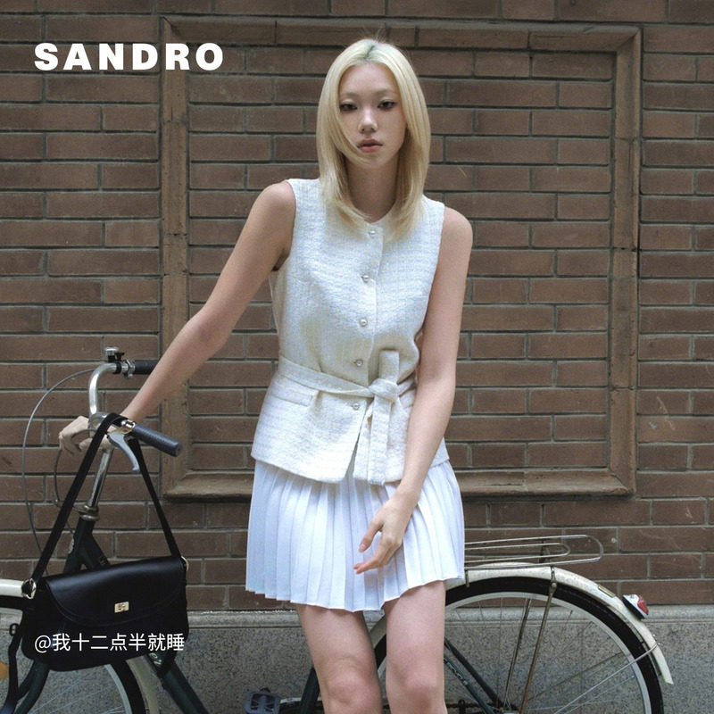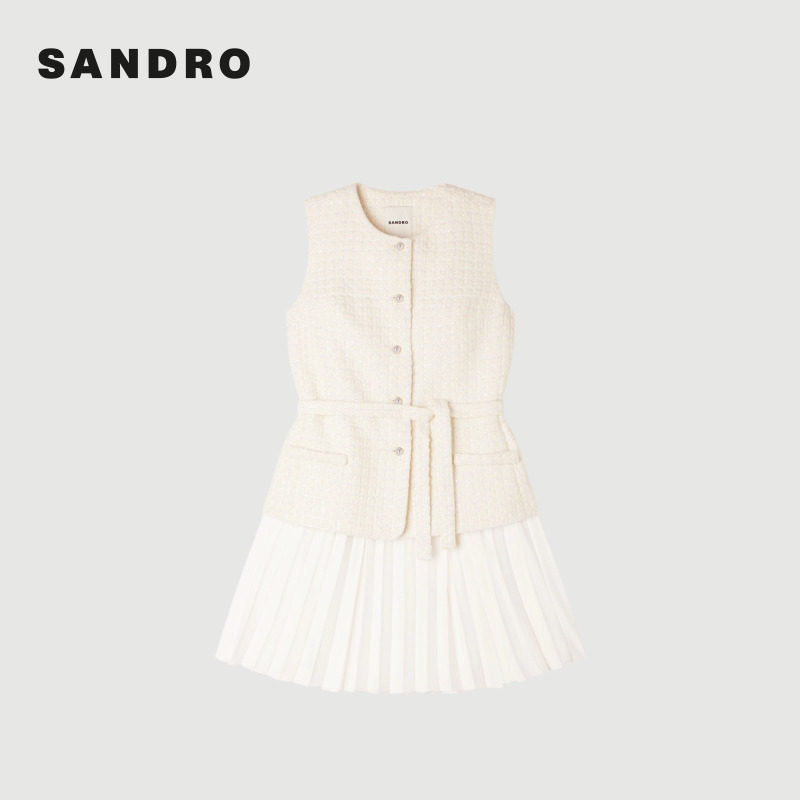 情人节礼物SANDRO2026春季新款女装法式粗花呢马甲拼百褶连衣裙