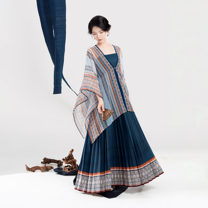 织造司[赴云端]侗族对鸟纹浅蓝披衫度假吊带连衣裙女百褶裙中长裙