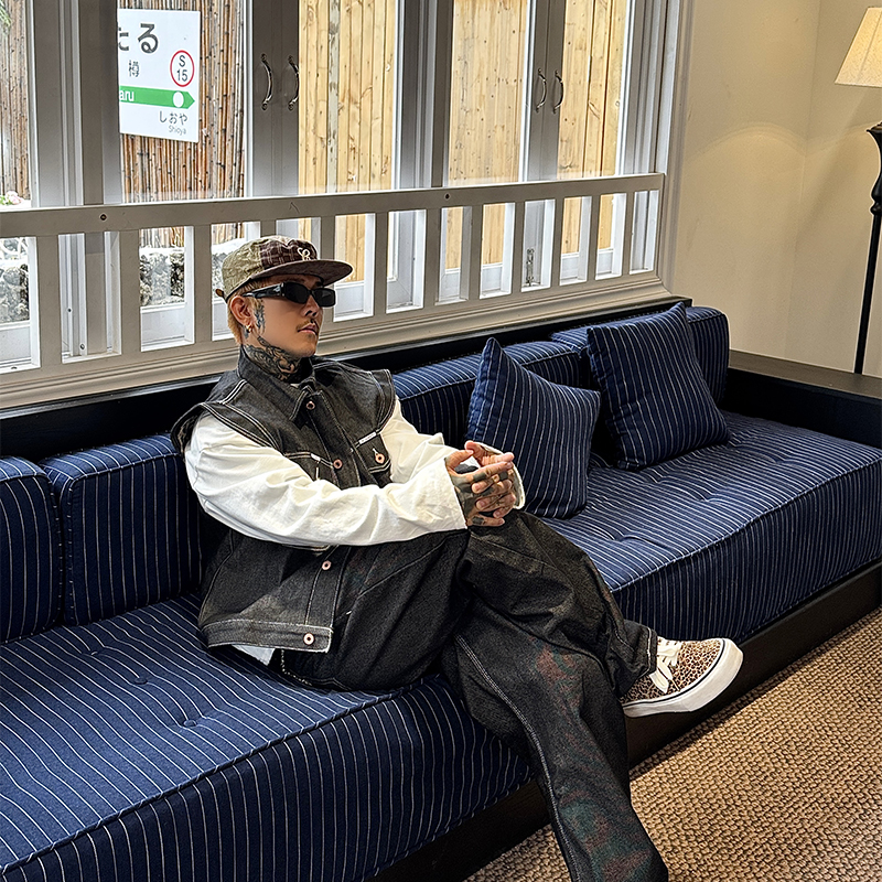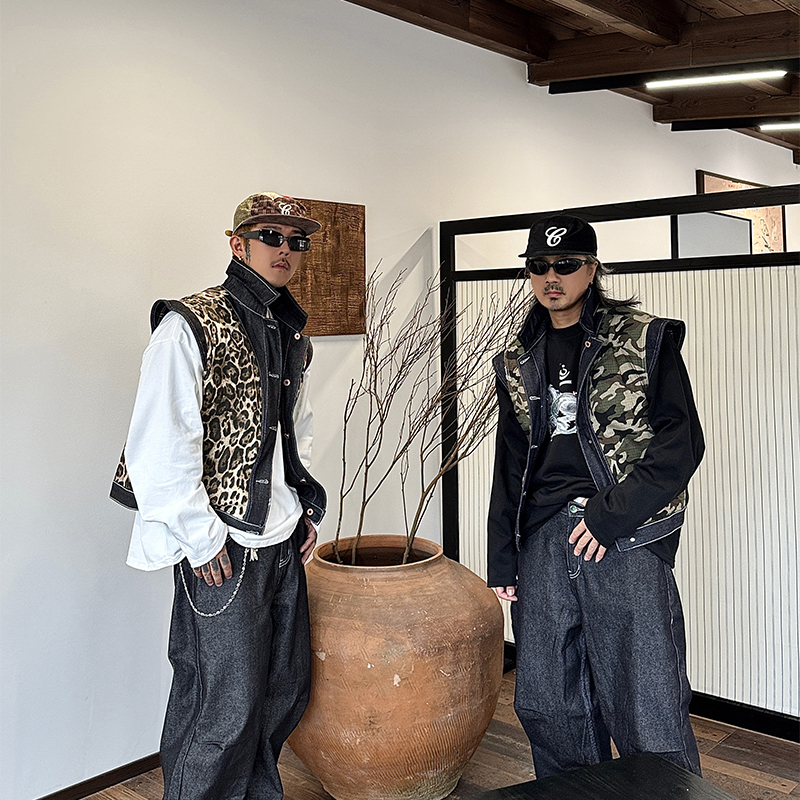 白鹤大人原牛设计字母刺绣双面穿坎肩马甲男复古洗水做旧夹克外套