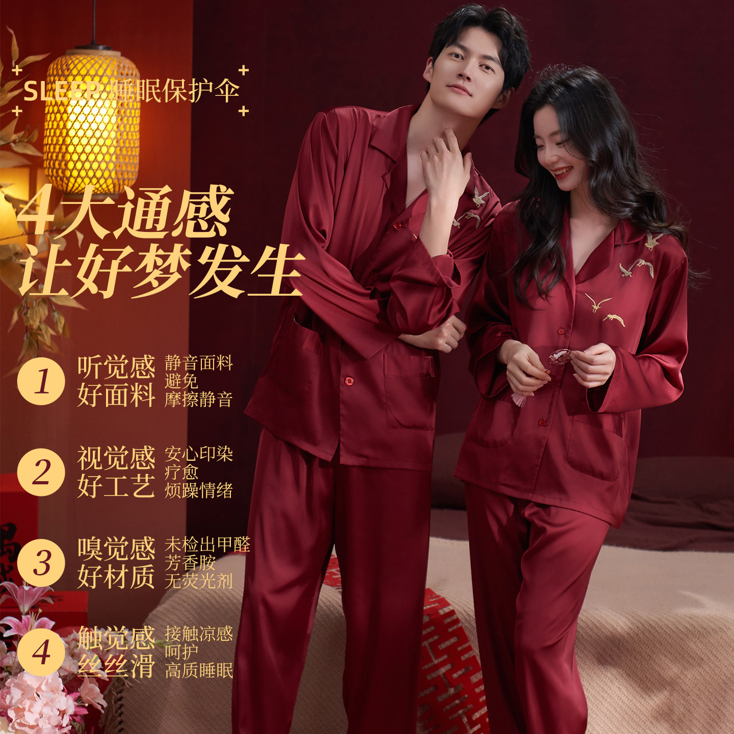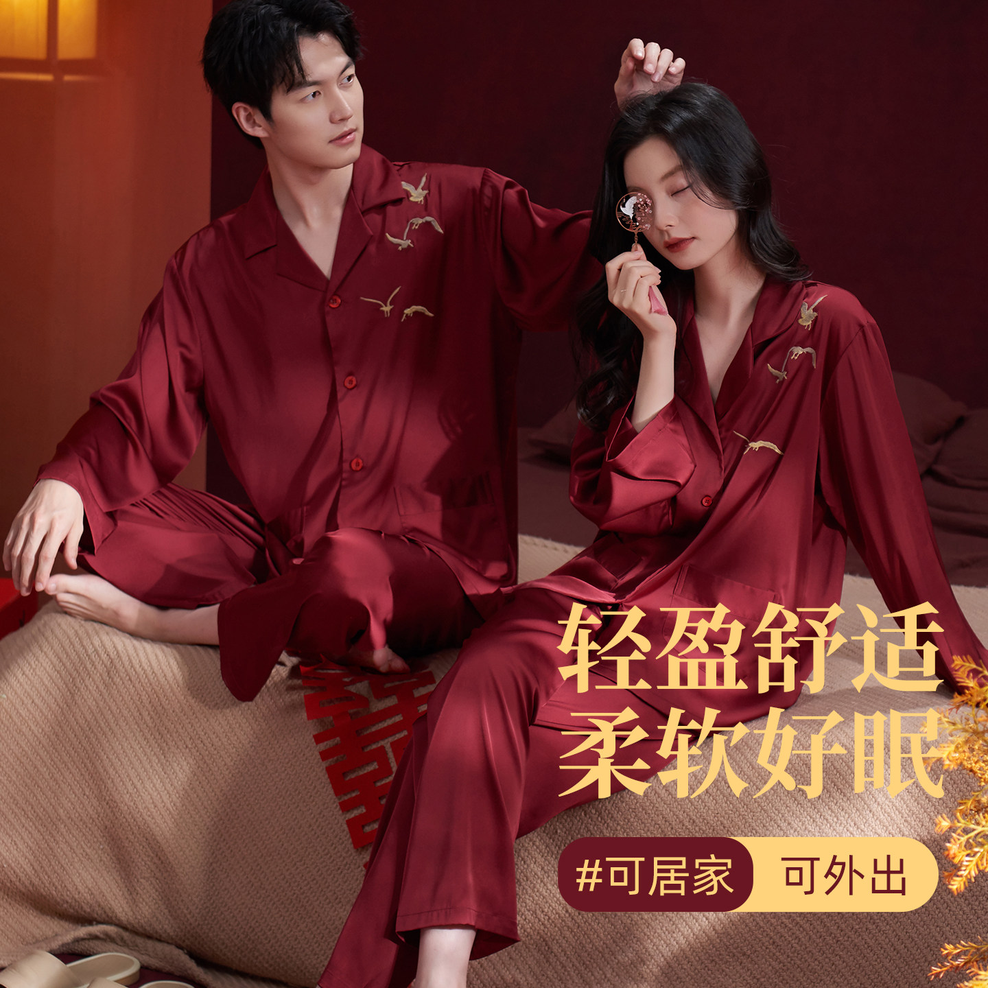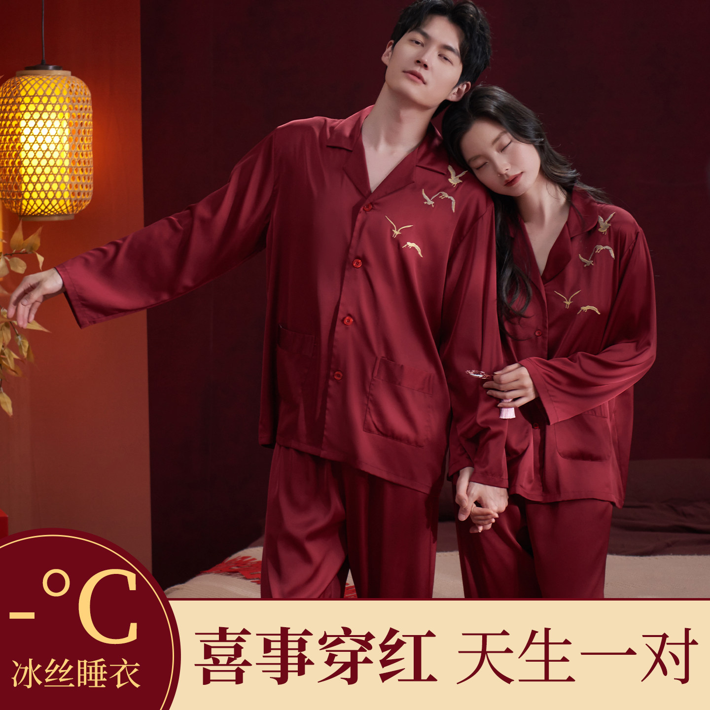 乐姿梦情侣红色睡衣春夏季柔软冰丝套装男女士喜庆结婚新婚家居服