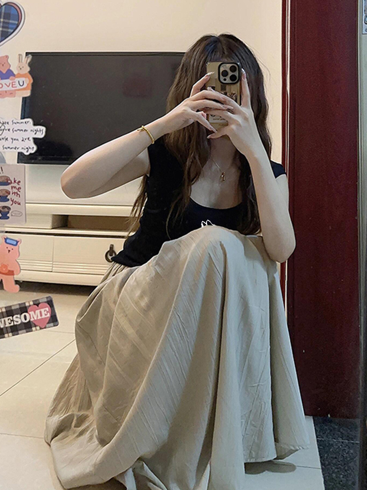 时髦无袖短袖t恤女生夏季方领小猫印花正肩修身纯棉吊带背心上衣