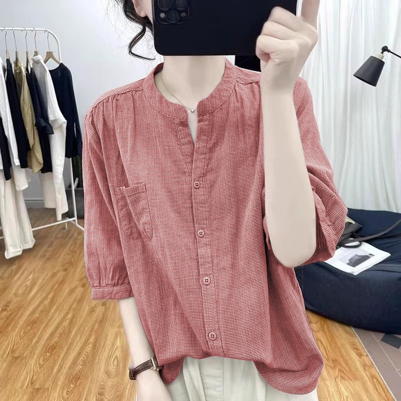 千鸟格五分袖棉麻衬衫女亚麻上衣