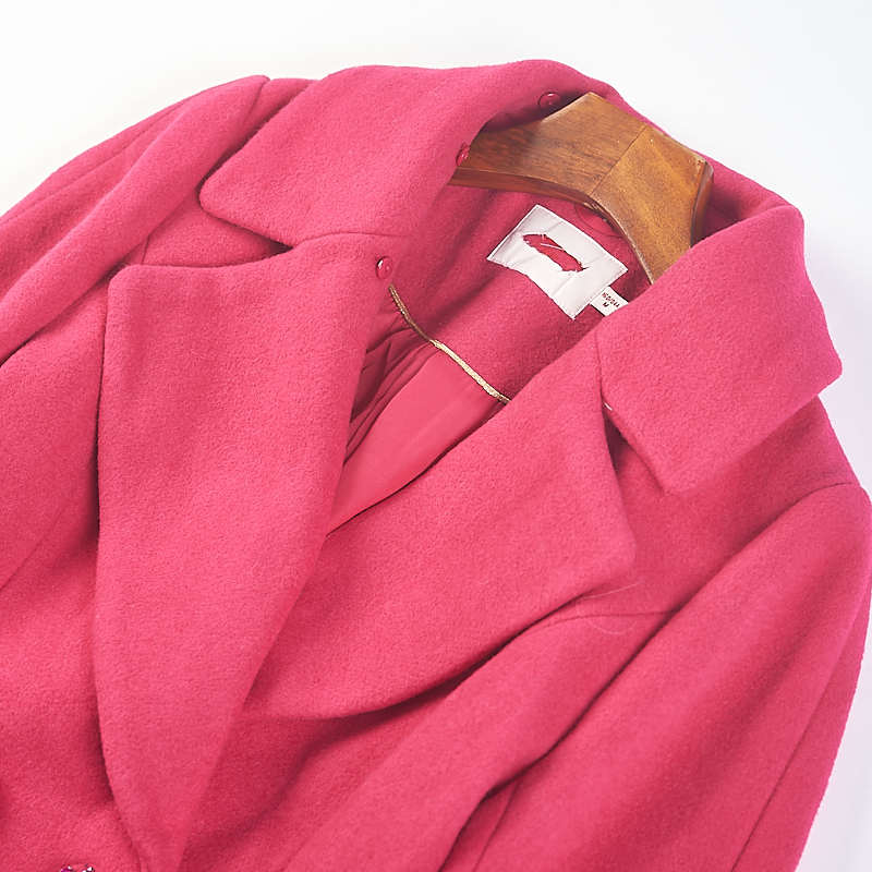 韩版玫红色羊毛呢大衣女11.4H76742秋冬复古两粒扣中长款风衣外套