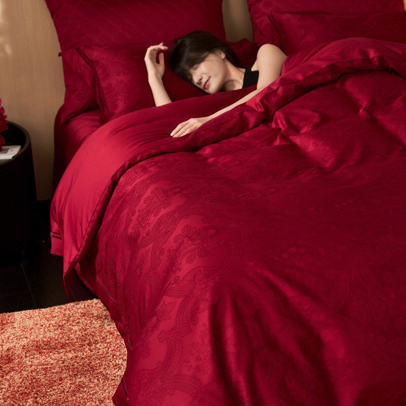 长绒棉提花四件套全棉结婚庆大红色高级感刺绣被套床单婚嫁