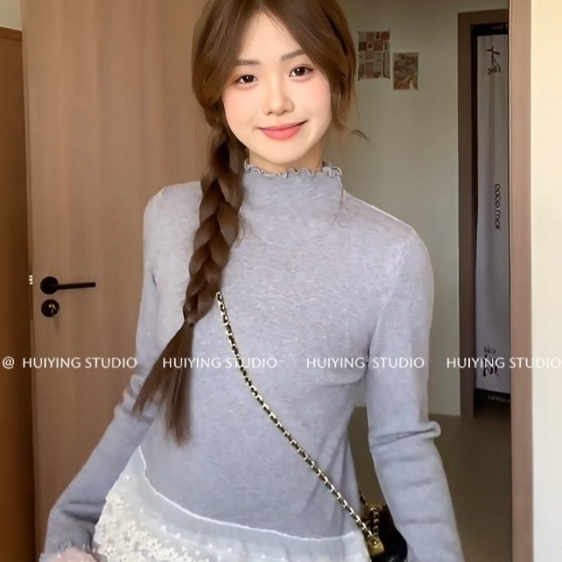 韩系甜美风蕾丝拼接高领长袖t恤女秋冬软糯木耳边打底衫短款上衣