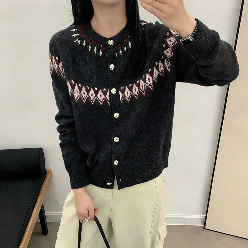 费尔岛提花拼色100%纯羊毛开衫女圆领加厚宽松针织毛衣外套羊绒衫