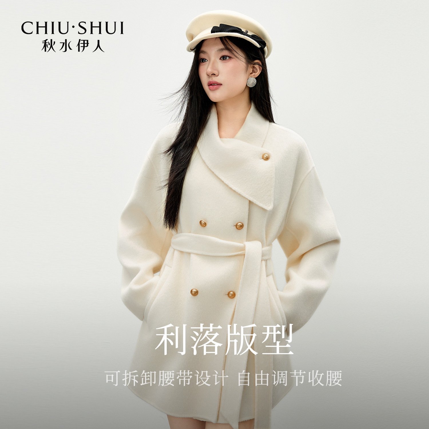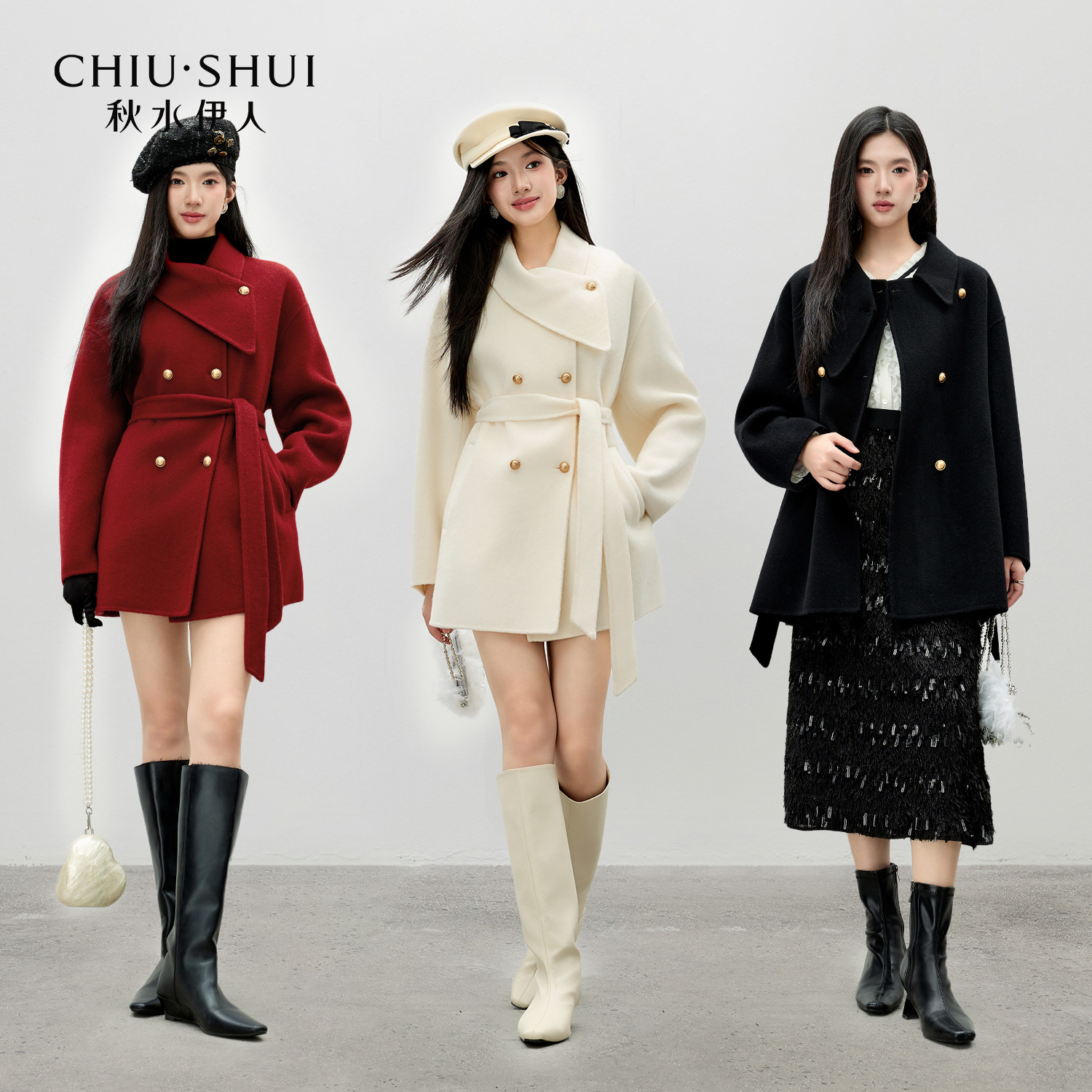 秋水伊人绵羊毛优雅翻领毛呢外套