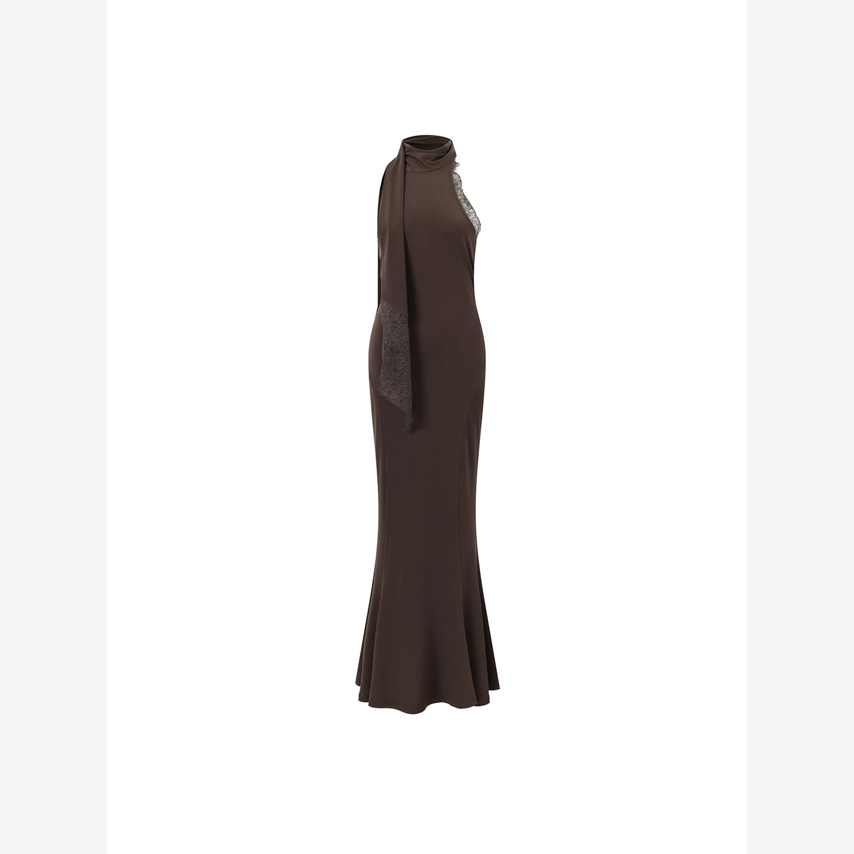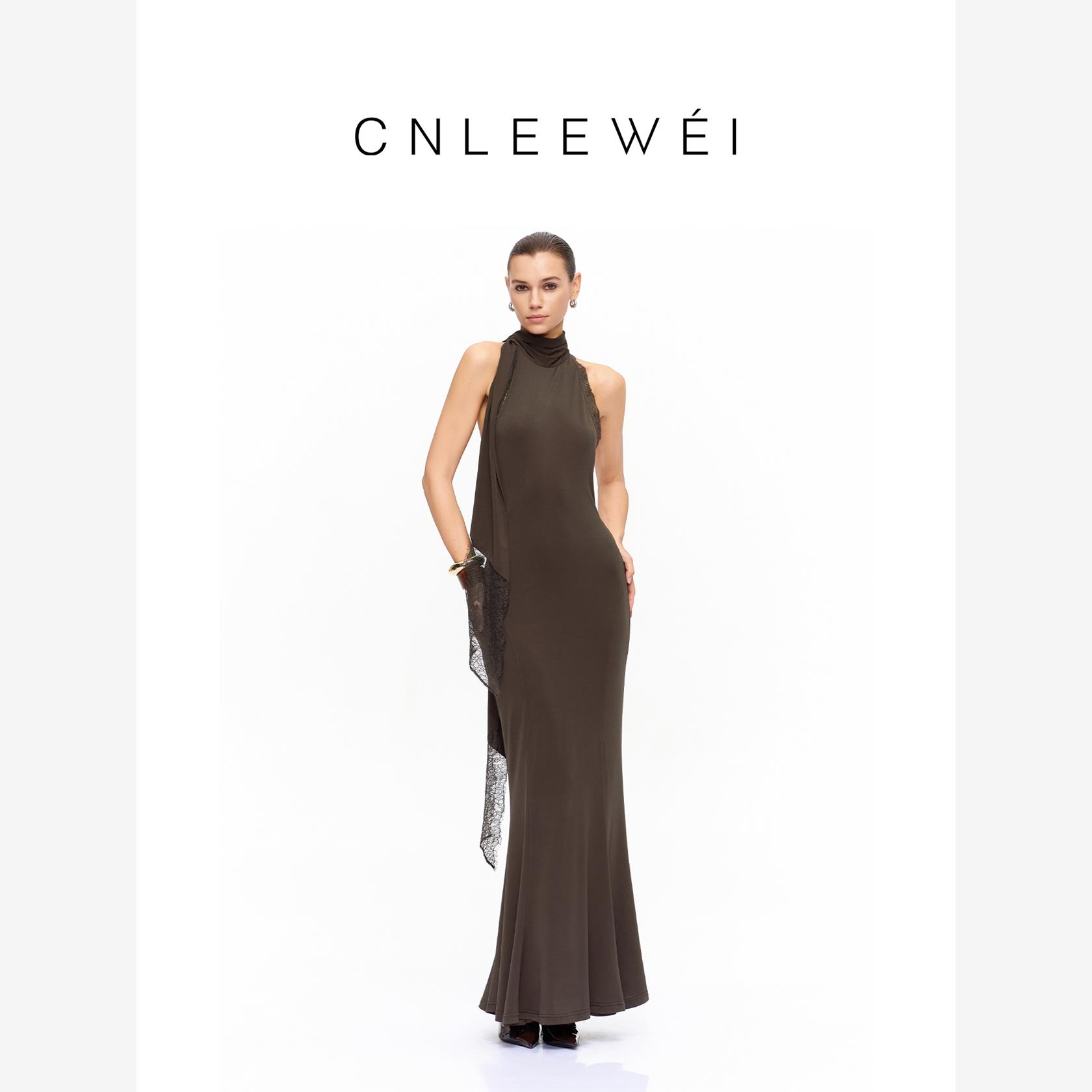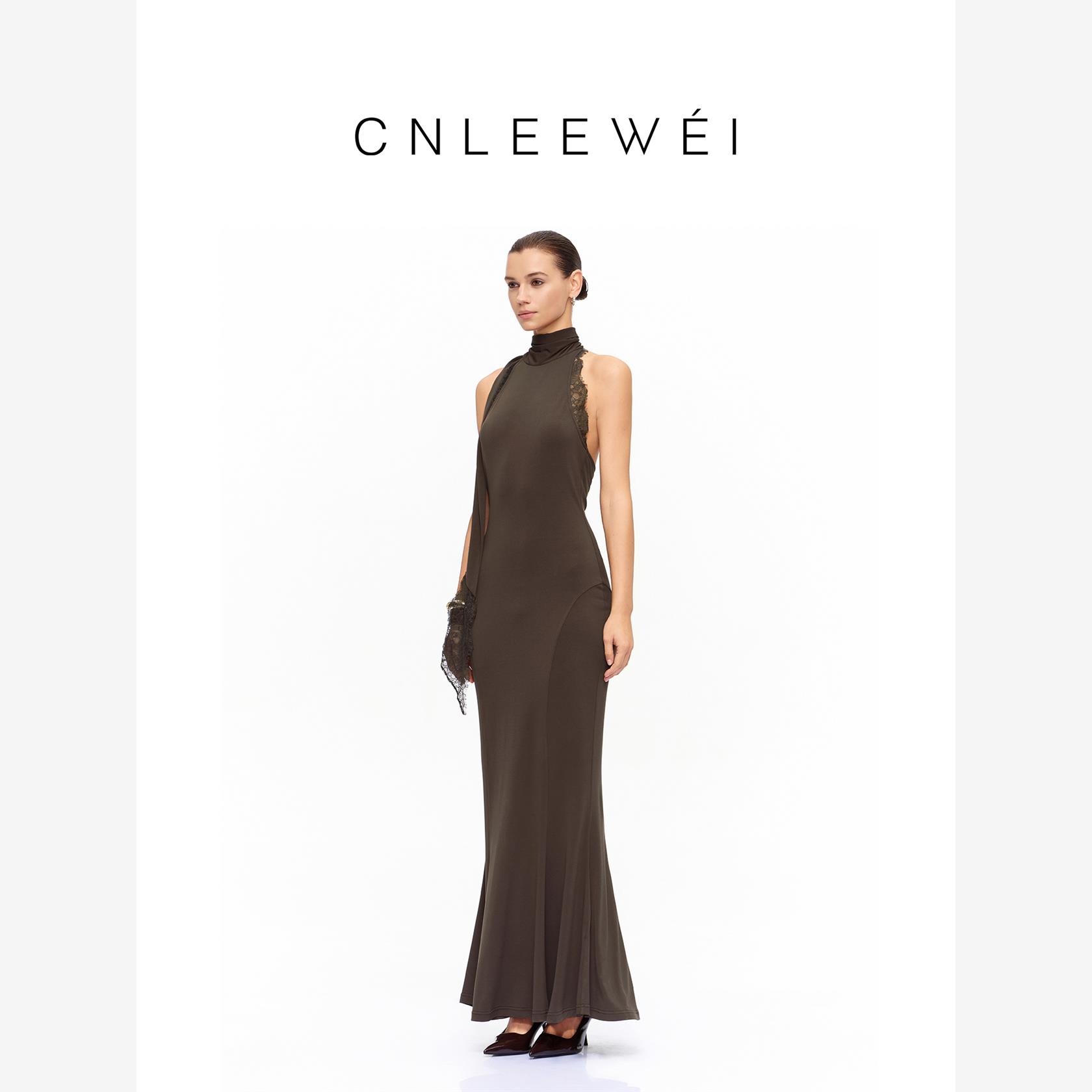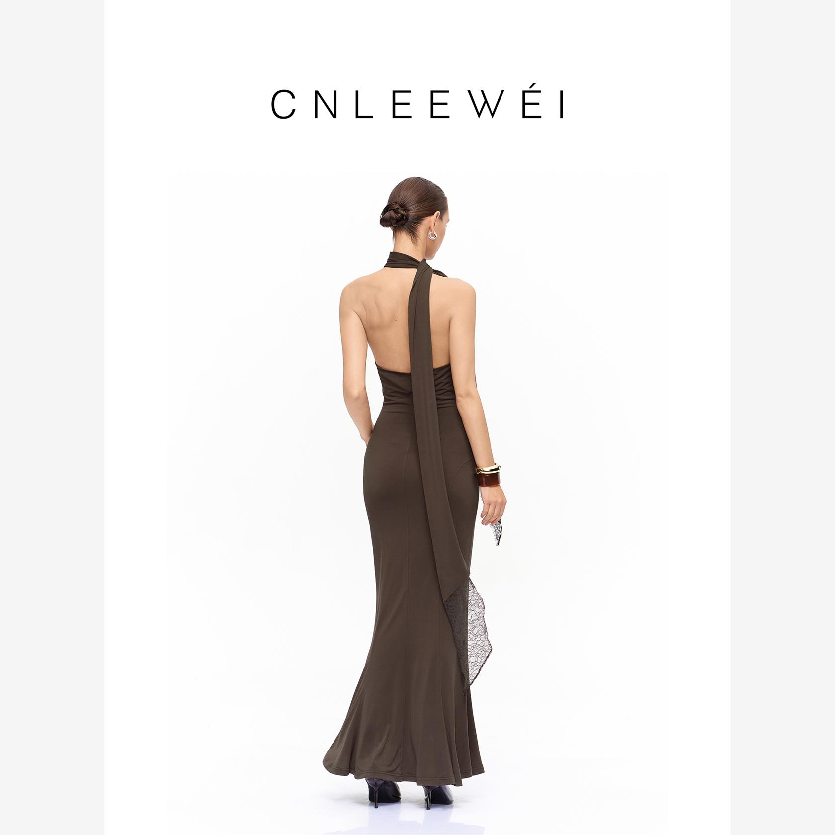 CNLEEWEI 2025年秋季新款飘带蕾丝收腰鱼尾挂脖露背长连衣裙