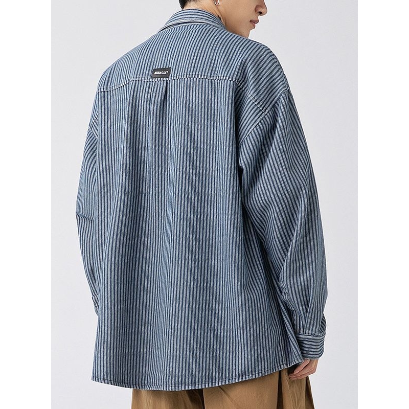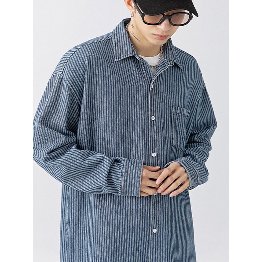 牛仔衬衫男士日系复古条纹长袖衬衣男生初秋户外休闲蓝色工装外套