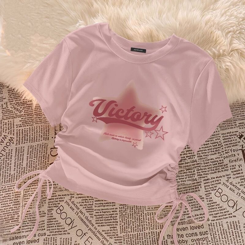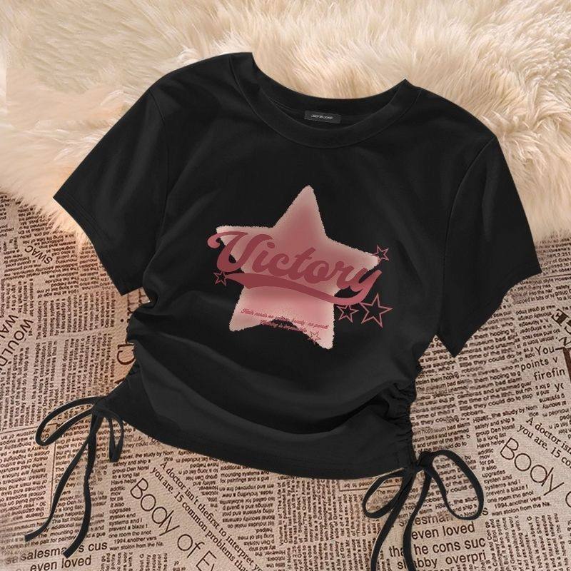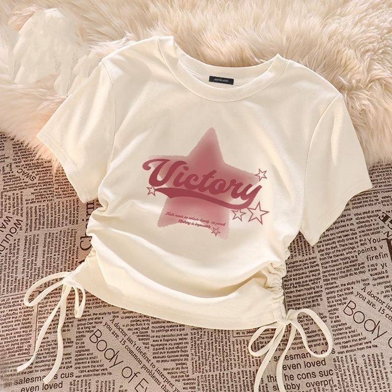 杏色星星印花短袖t恤女夏季新款辣妹抽绳设计感小众短款百搭上衣