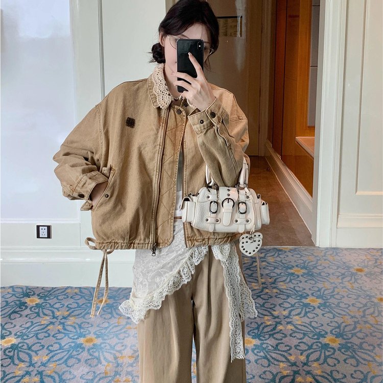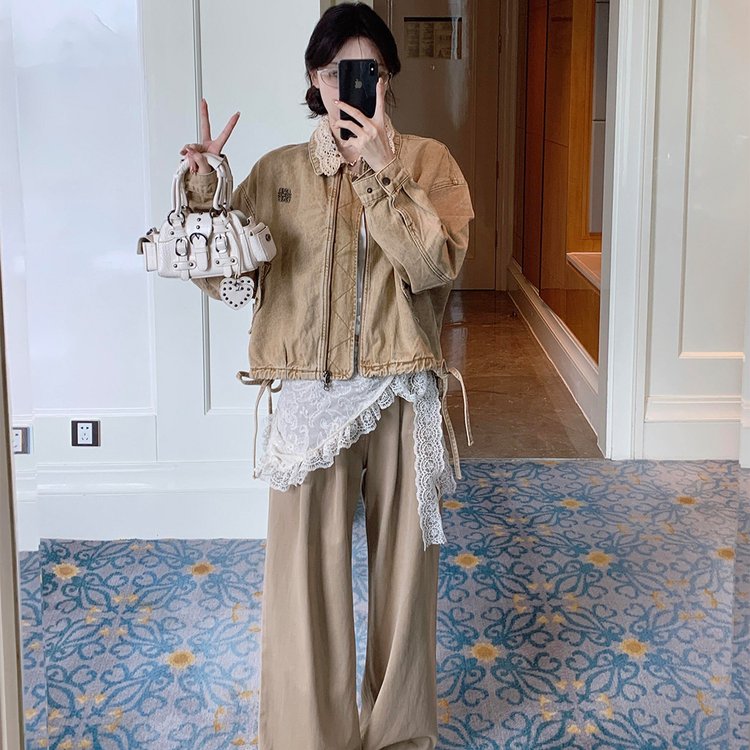 卡其色复古拼接牛仔外套女春秋季2025新款设计感百搭短款夹克上衣