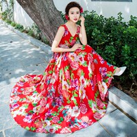 沙滩度假裙子复古V领长裙红色牡丹碎花雪纺大摆抽绳系带连衣裙女