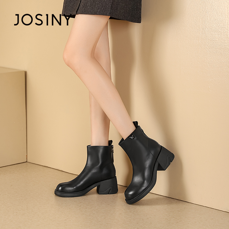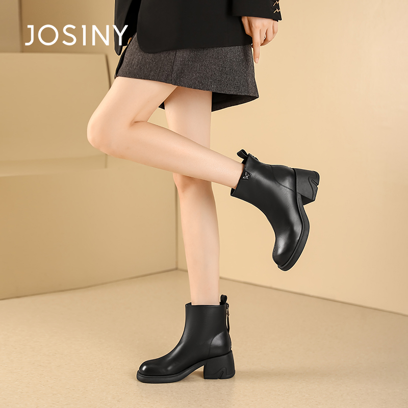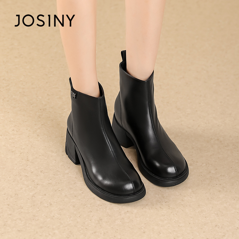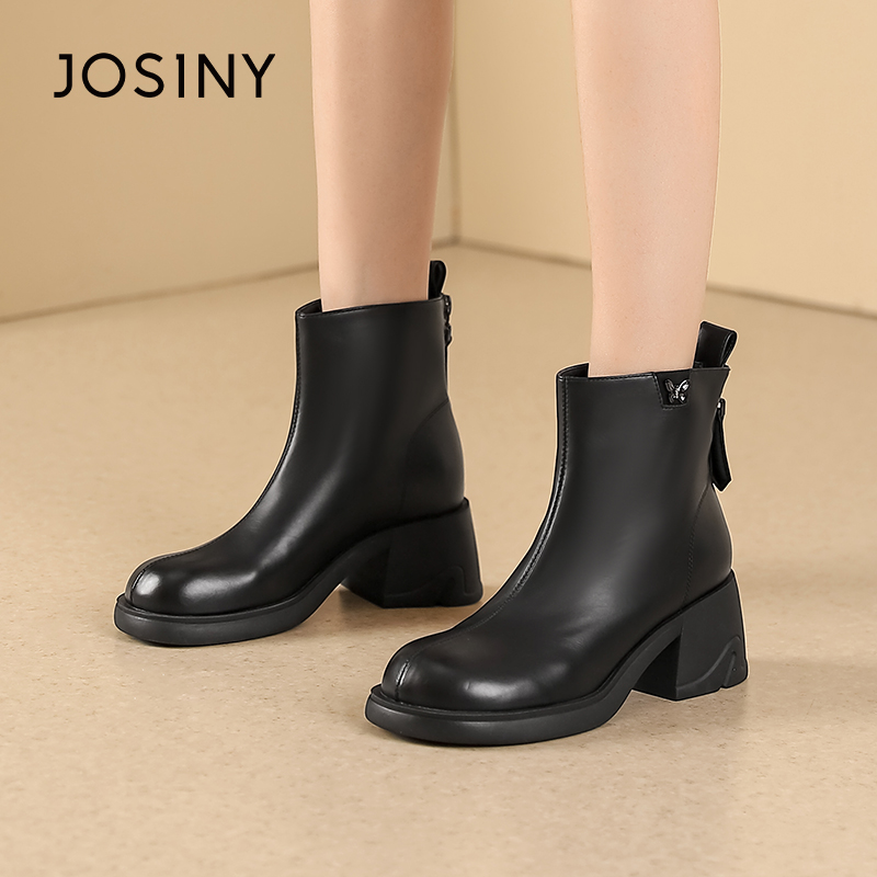 卓诗尼女靴冬季撤柜正品英伦厚底瘦瘦靴舒适圆头金属蝴蝶装饰百搭