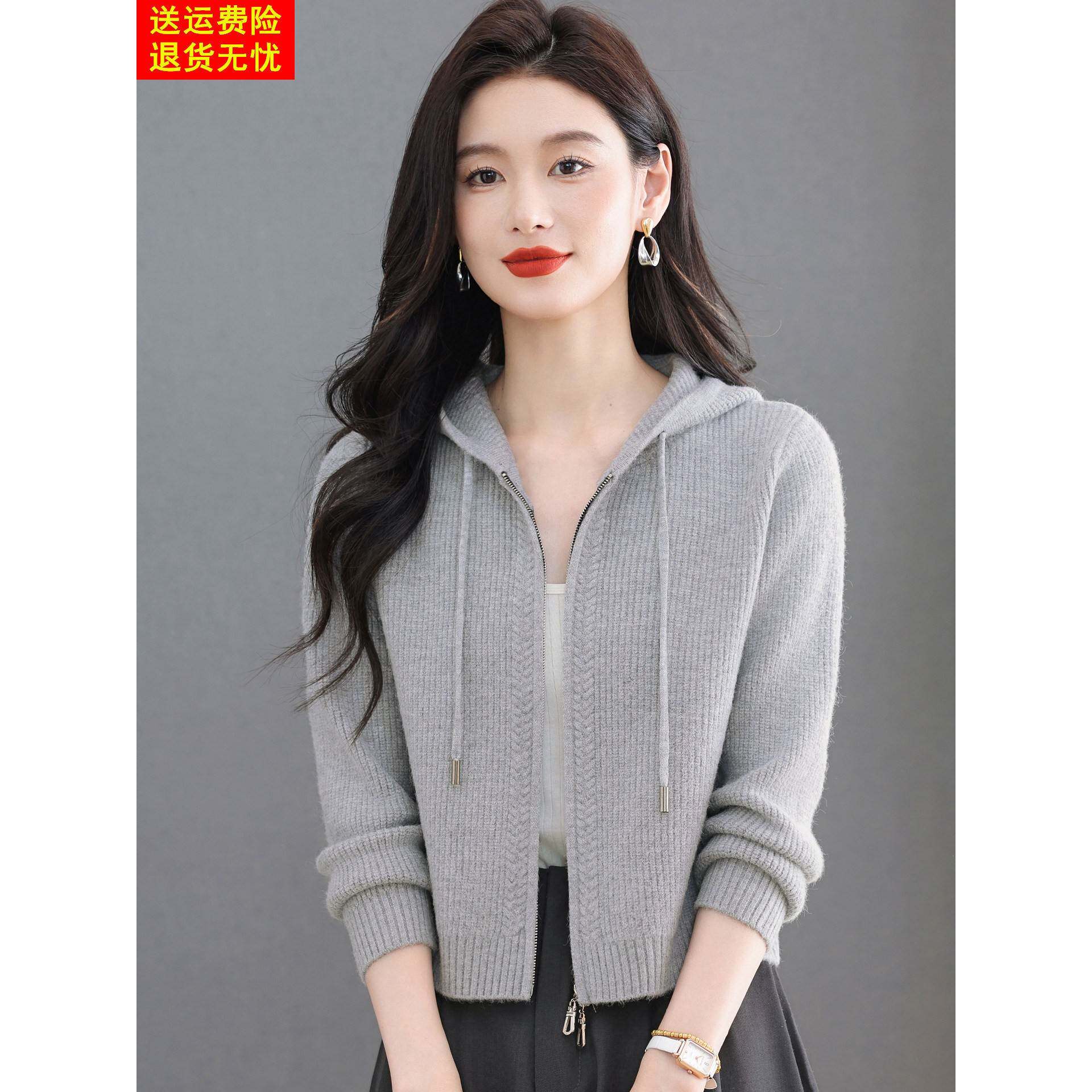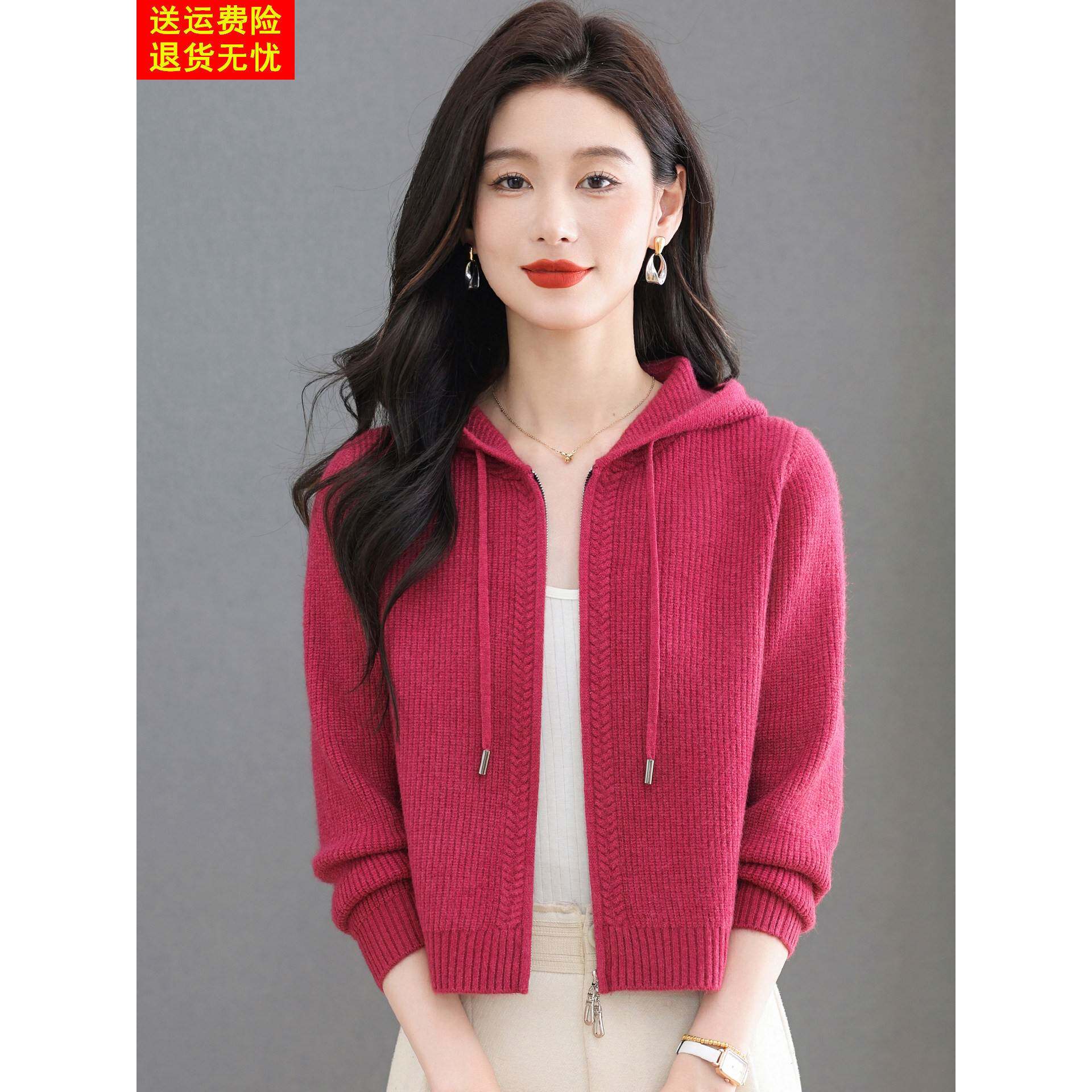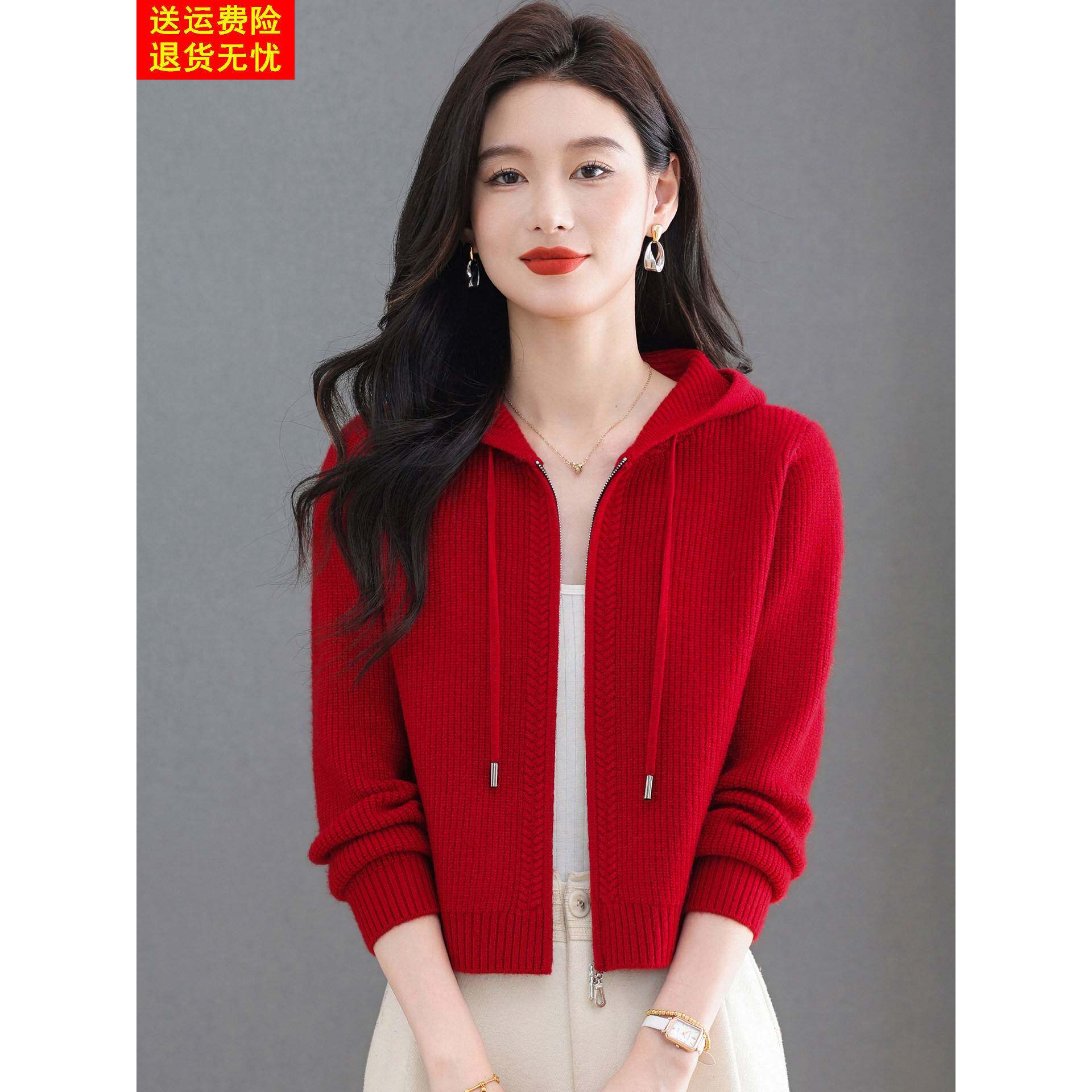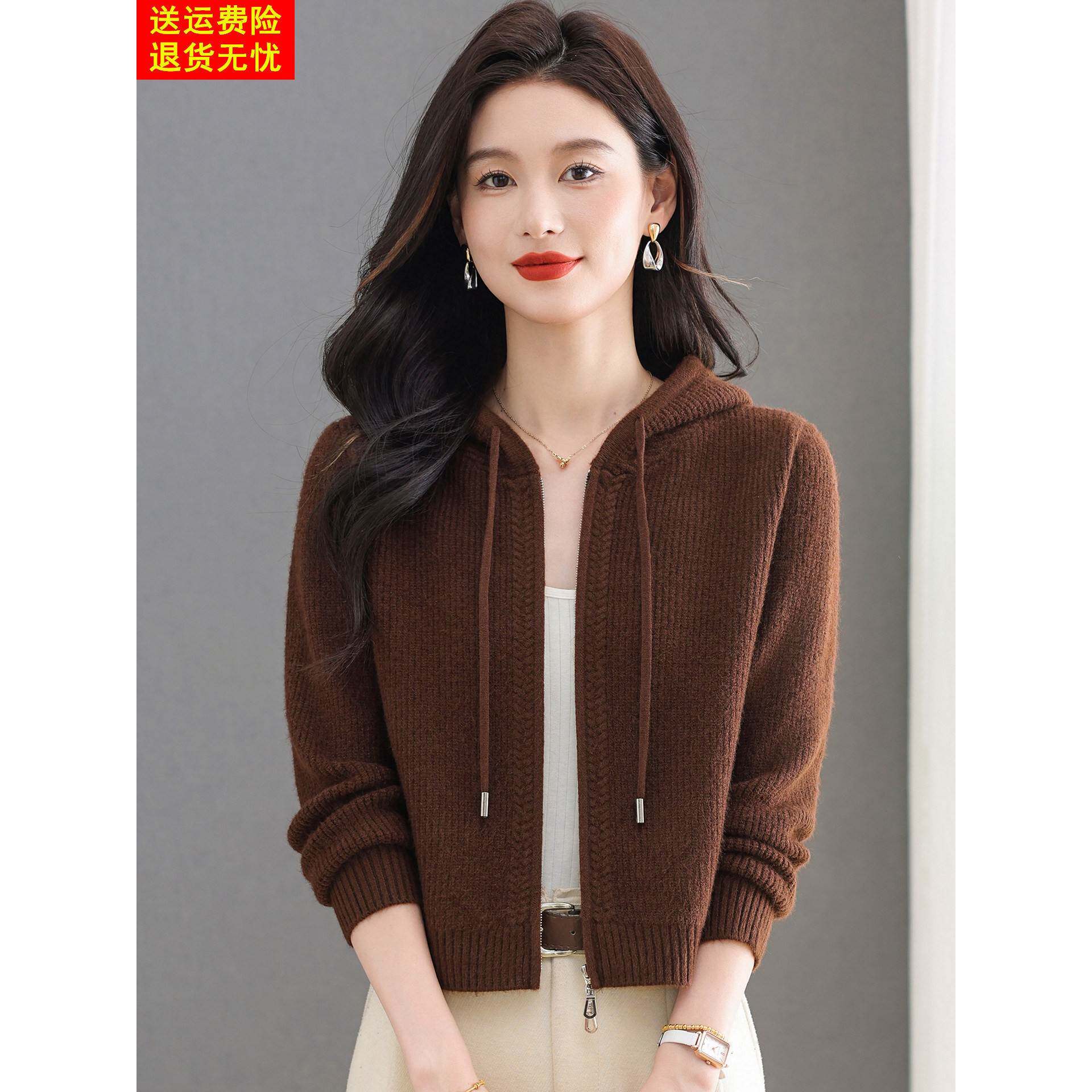 鄂尔多斯市羊毛针织开衫女秋冬新款拉炼外搭短款配裙连帽毛衣外套