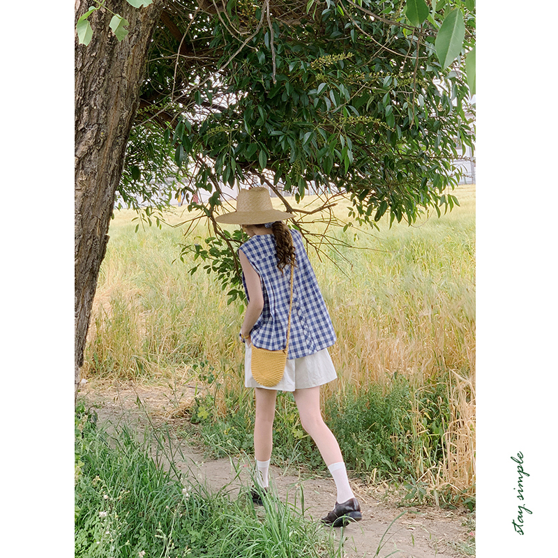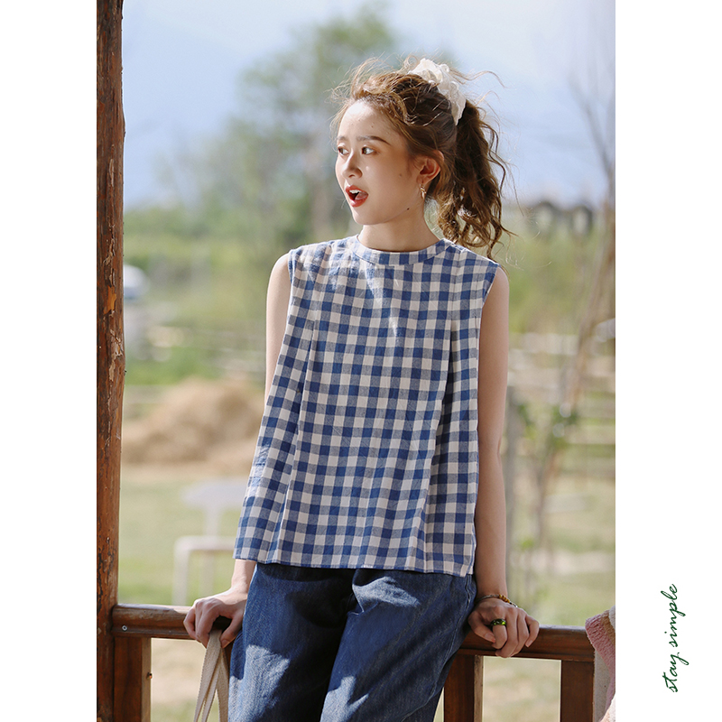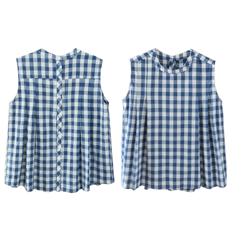 花吉B764蓝白色纯棉格子条纹打褶无袖衬衫女2025新款夏格纹衬衣