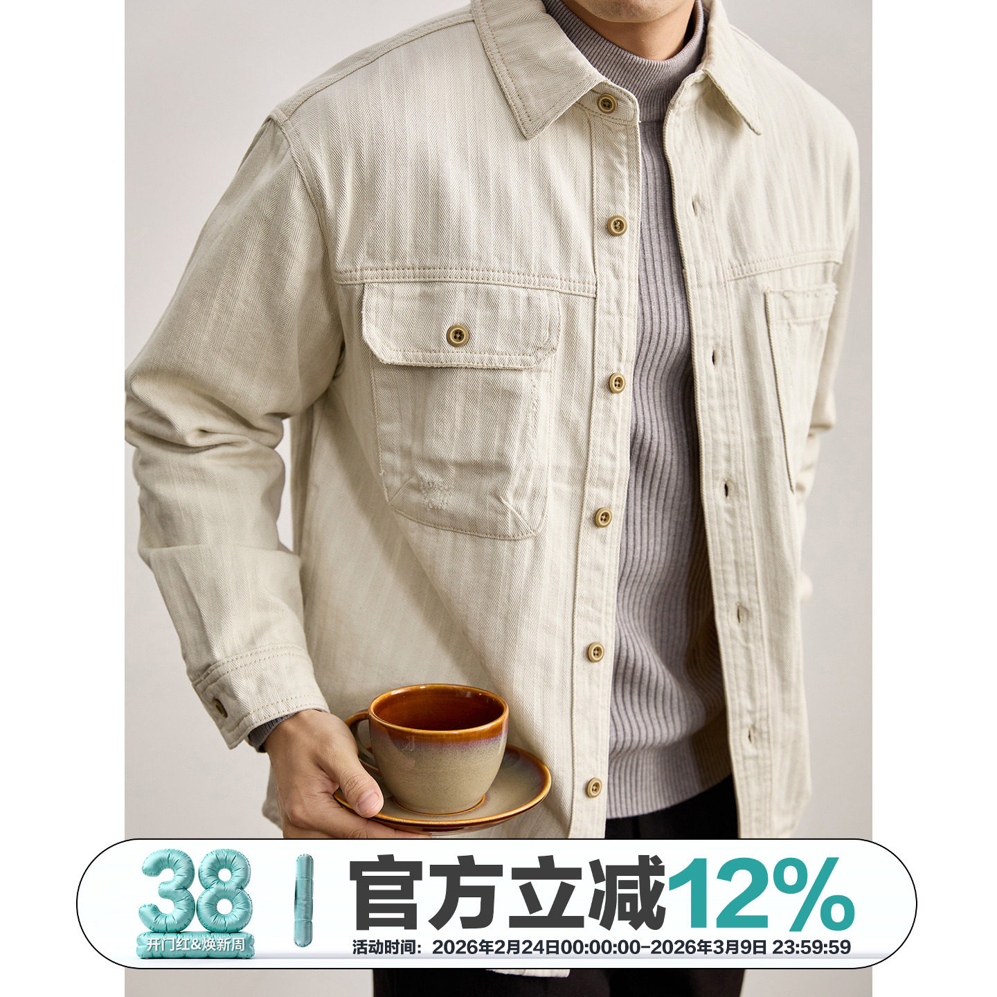 LUUD 水洗白牛工装风翻领牛仔衬衫男早春100%纯棉双口袋衬衣外套