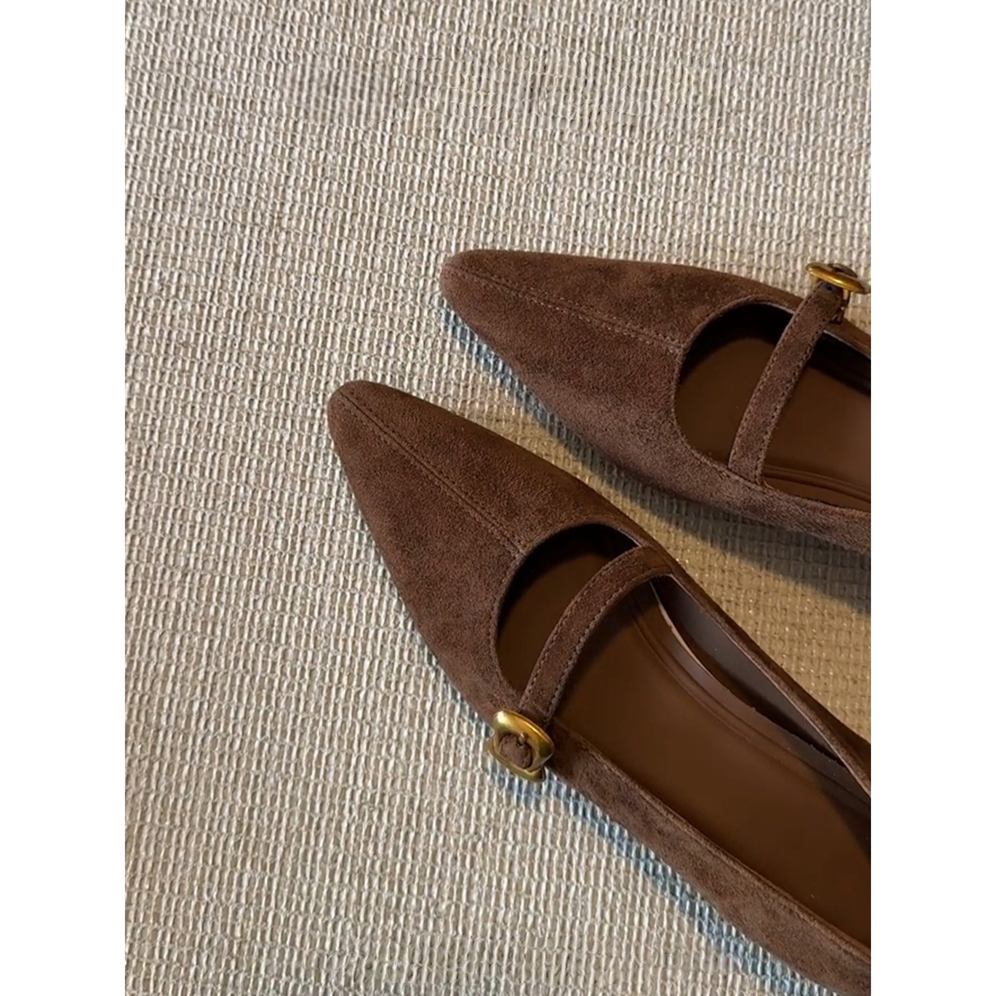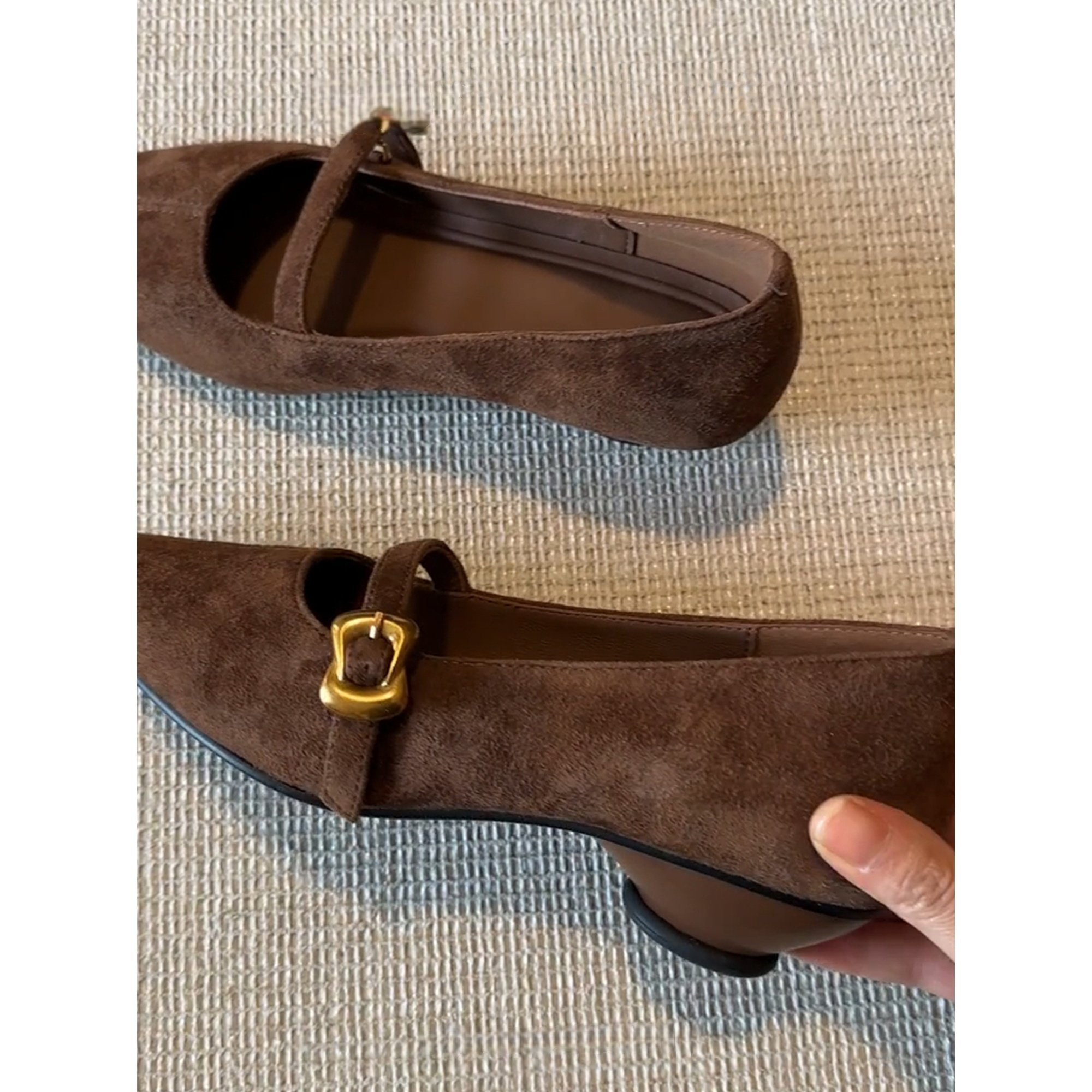 复古风磨砂皮粗跟玛丽珍鞋女新款时尚尖头百搭纯色一字带中跟单鞋