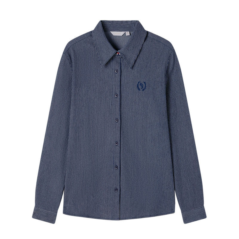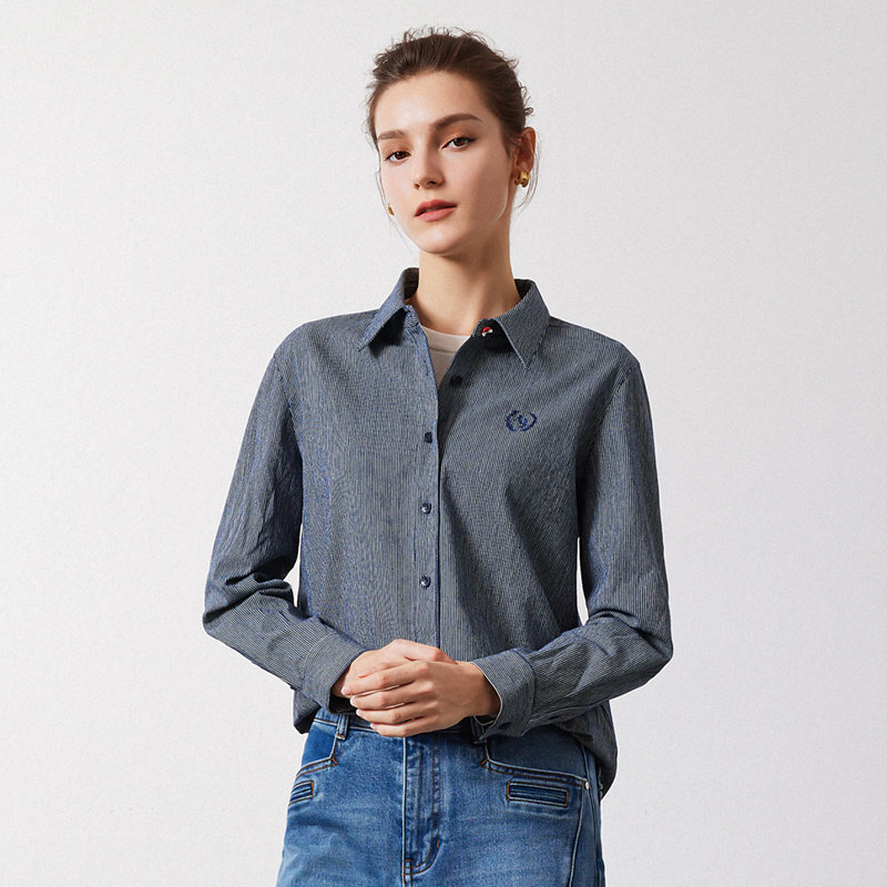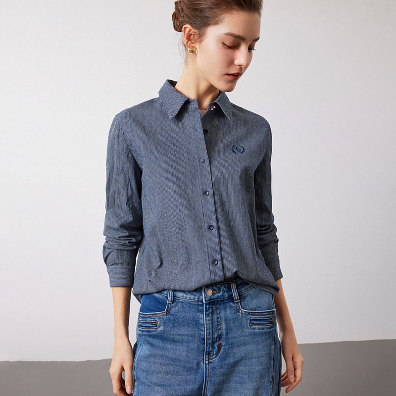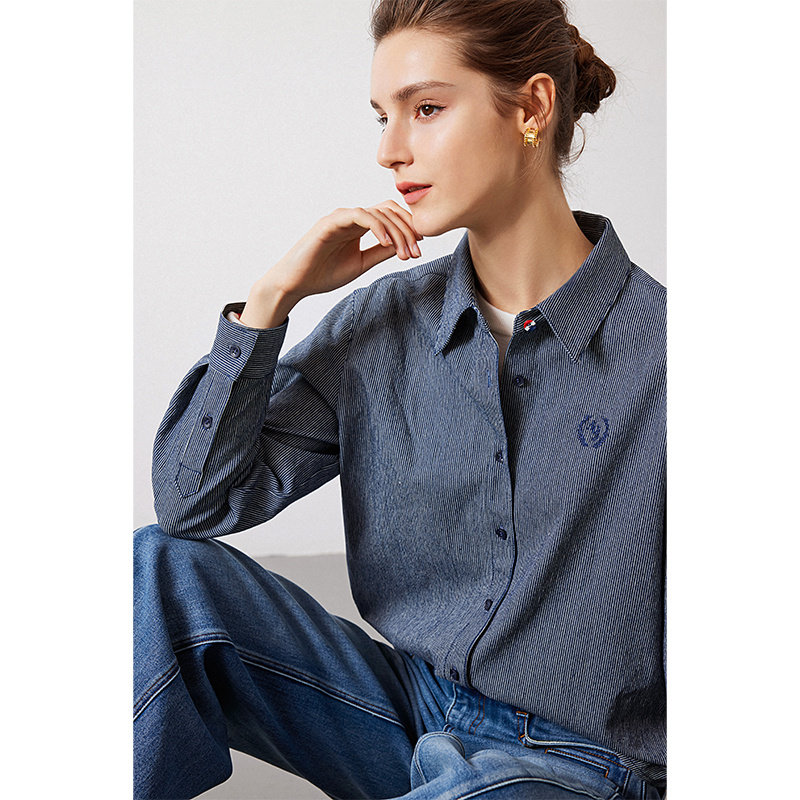 Navigare意大利小帆船秋季新款蓝色条纹衬衫女长袖休闲刺绣衬衣